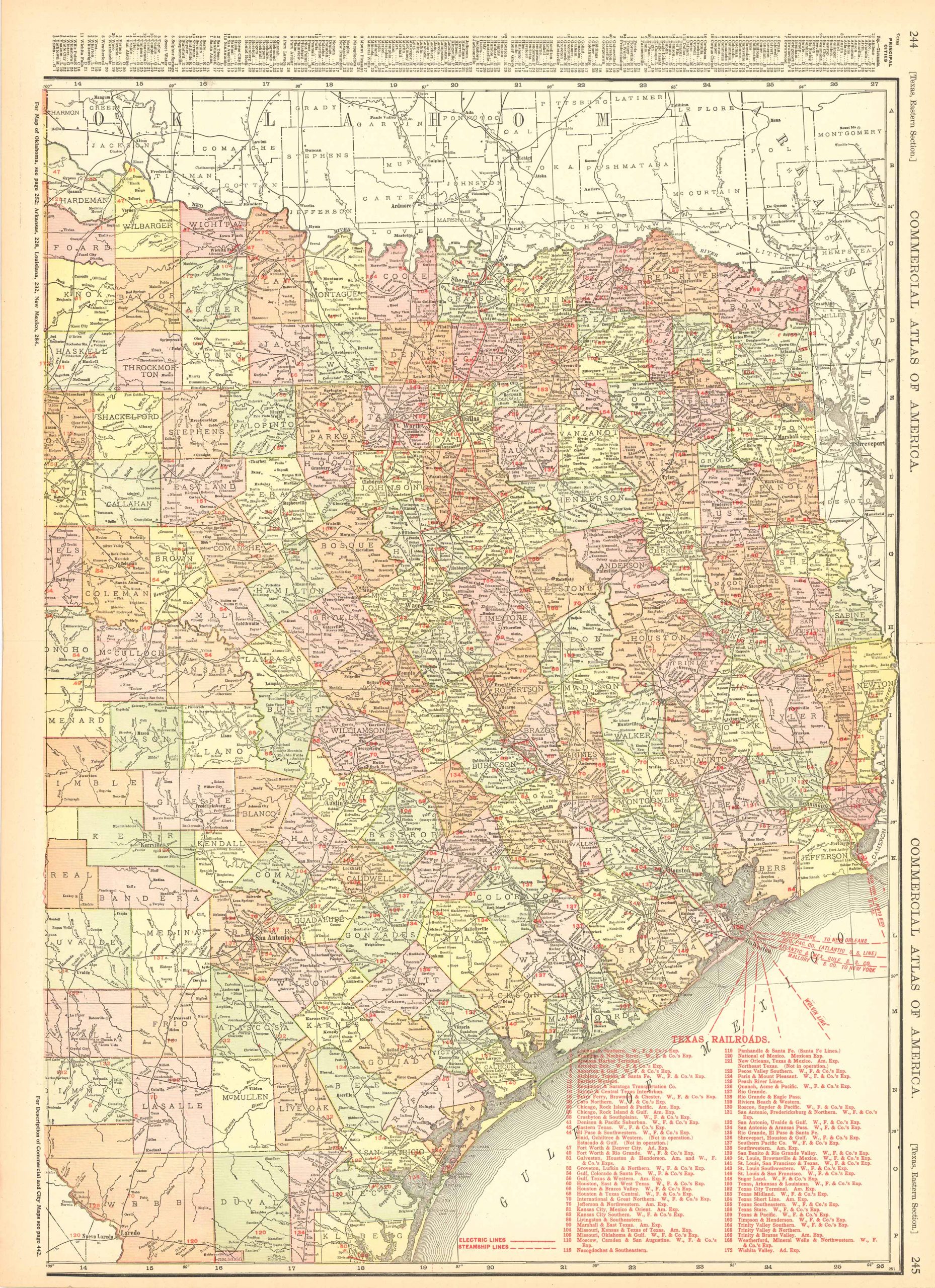 This map of Texas, Eastern Section was produced by Rand McNally and Co. as part of its Commercial Atlas of America. These maps are some of our favorite maps because of the large size of each map. The detail shown on each map is exceptional because of the map size. These maps were intended to be used by business for shipping and other uses. Roads, railroads, rivers, and buildings are clearly shown. There is more detail on these maps than any others during this time period.