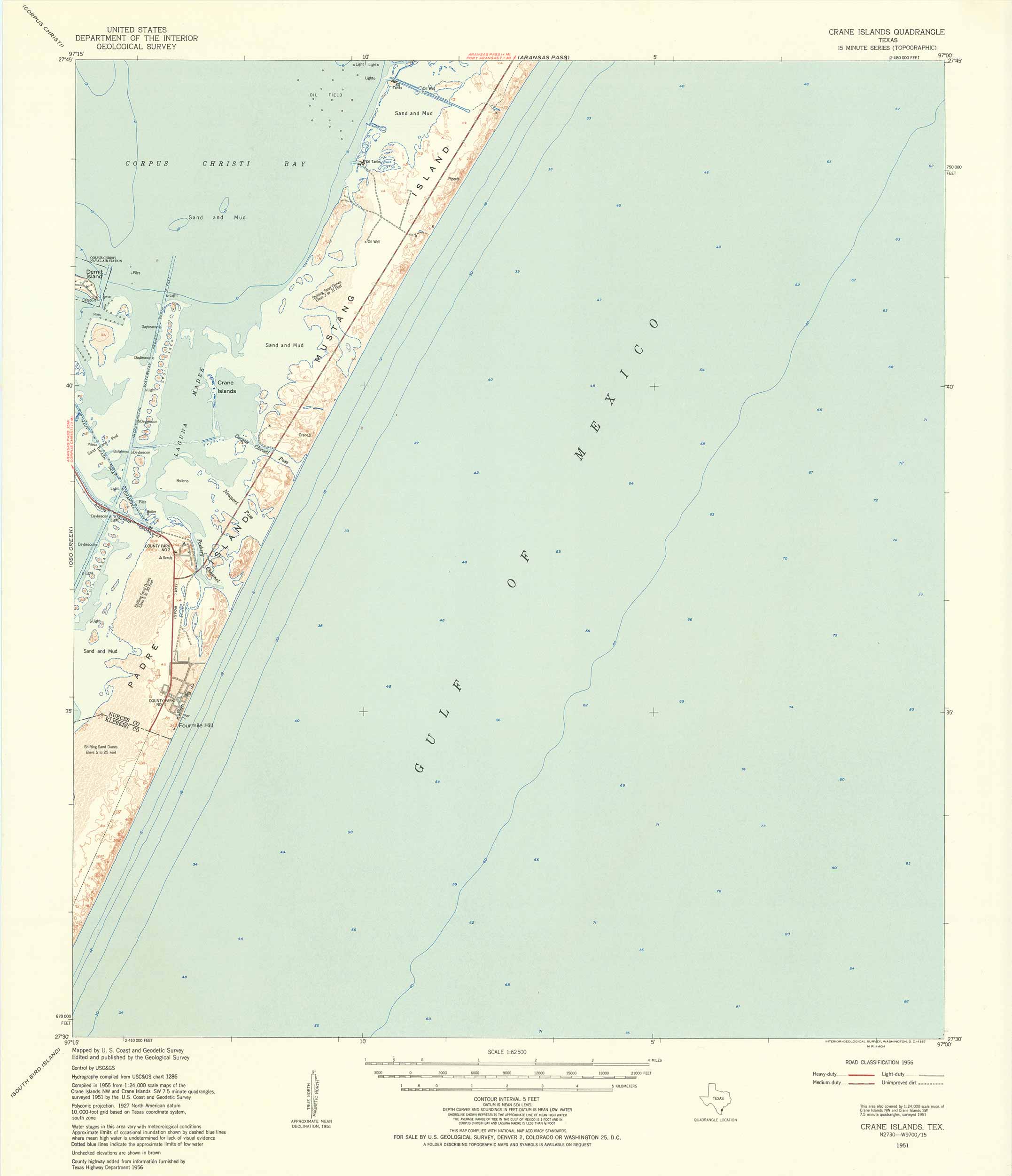 USGS 1951 Crane Islands Quadrangle, Texas, Padre Island, Mustang Island, Corpus Christie