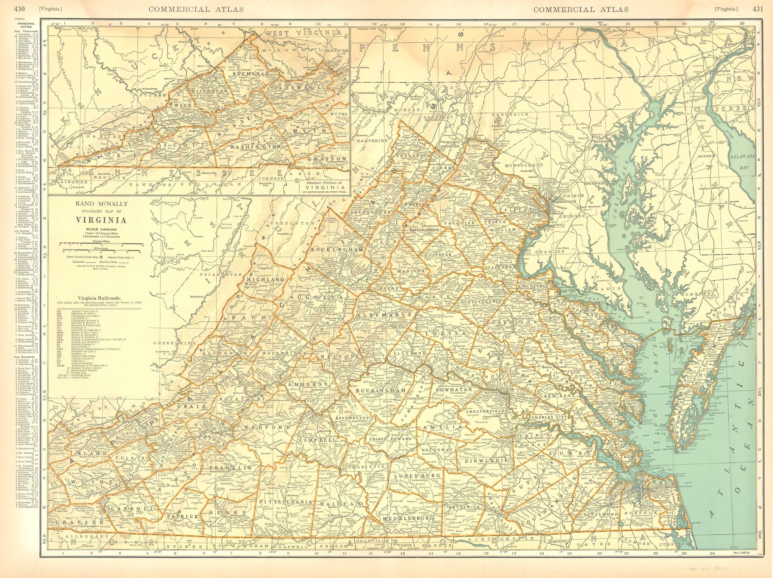 Rand McNally & Company, still a major name in map publishing to this day, began as a small print shop opened in Chicago in 1856 by William H. Rand. The shop originally printed guidebooks and directories. In 1858, Rand hired Andrew McNally who was later to become a partner. Within the next few years, the shop got into the railroad business by starting to print railway tickets and schedules, a key step in the development of the company. The ticket printing led to the publishing of railway guides, and by 1872 Rand McNally and Company had the capacity to publish maps. This map of Virginia came from Rand McNally’s Commercial Atlas. A highly successful run of atlases that lasted over a decade. These maps were primarily used by business, because of their accurate listing of railroads in operation as well as tables of statistical information. This map is unique in several ways, their large format makes an impressive display, and offers additional room where many small towns and extra details are included. Additionally a list of every railroad operating in the state in 1932 is included. All railroad routes are shown on the map. This map includes all cities and towns, lakes, rivers, and bodies of water. All topographical features are also included as well as political features such as counties and Native American Indian reservations.