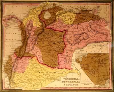 Art Source International is proud to present maps from Henry Schenk Tanner’s “New Universal Atlas”, a volume of work which in 1828 was hailed as a great advancement in the art and science of map-making. Tanner gained notoriety for this work and the one he published before it, his “New American Atlas.” Both were widely considered to be important contributions to early American cartography. This remarkable and rare map of Venezuela, New Grenada and Equador was created for the 1836 edition of the “New Universal Atlas.” The unique look is framed by a sage and pink border that complements the original hand coloring in the image of the map. An inset highlights a plan of proposed communication between the Atlantic and Pacific oceans. Rivers, lakes, mountains ranges, towns and cities are all listed at one of the greatest degrees of accuracy for maps produced at this time. This map is a true american rarity!!!