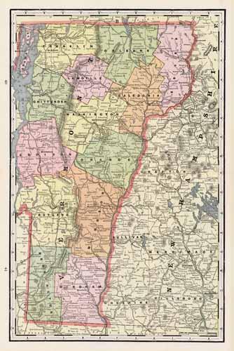 This colorful map came from Crams 1898 Universal Atlas – Geographical, Astronomical and Historical. In 1869 the George F. Cram Company was born and the Cram name quickly became synonymous with accuracy and innovation. This map of Vermont shows the primary towns, rivers, mountains, roads, and railroads. Each particular county is labeled and colored. This map is a large scale, double page fold-out.