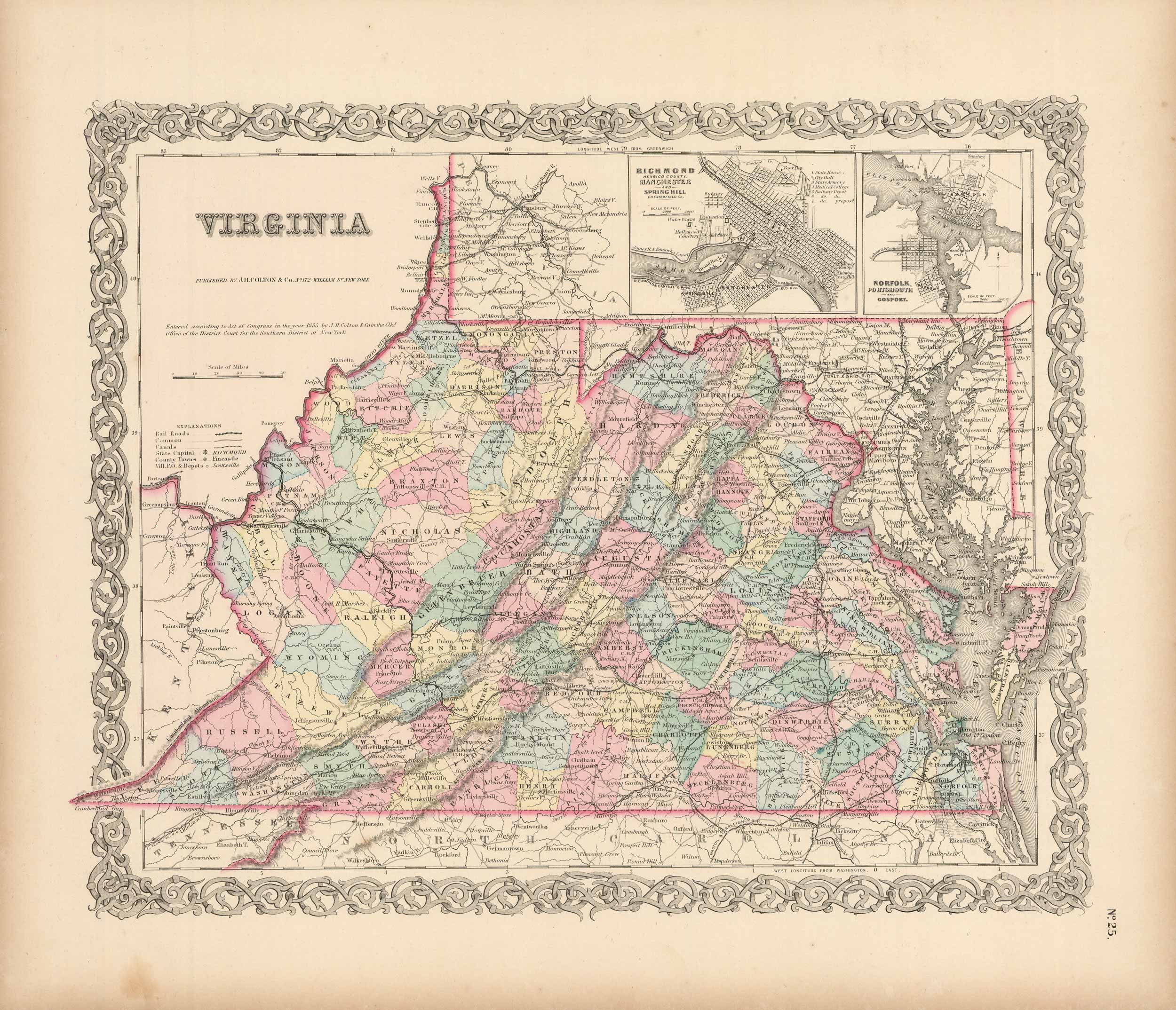 Art Source International is proud to offer this map from the 1856 edition of Coltons Atlas of the World. Colton atlases, especially those from the 1850’s, have become increasingly rare. These maps have the signature 3/4″ Colton border surrounding each map. The Colton firm refused to compromise quality, choosing to compete for sales in the finer quality international market rather than the inexpensive domestic one. Because of this, all maps were engraved by steel plates rather than by wax engraving which was the most common method used at this time. This map is very detailed with identification of provinces and or regions, cities, towns and villages, transportation routes including rail roads, common roads, and canals, rivers and lakes, battle fields, and mountain ranges. Each map has beautiful muted red, green, tan, pink, and yellow hand coloring. These are the only Colton maps we have encountered with outline color.