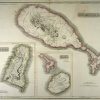 These large and stately steel engravings give a matchless view of individual islands. Naming each bay and point, as well as the towns and villages, we see the islands as they were in the early 19th century, on a scale that is unrivalled. This sheet features three maps on one sheet showing us St. Christophers (St Kitts), Nevis and St. Lucia