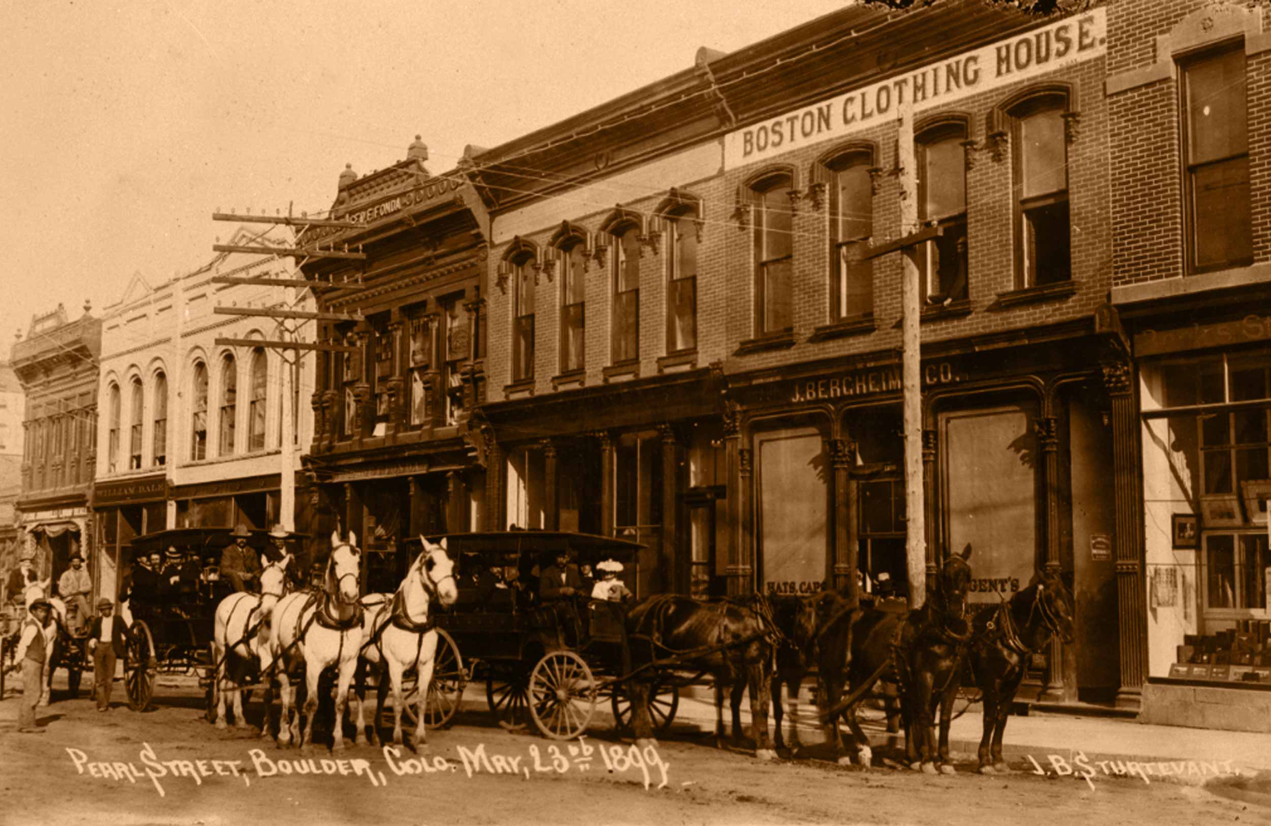 Store fronts and horse and carriages are pictured in this photo of 1200 Block of Pearl Street. The Boston Clothing House is shown, located at 1210 Pearl.