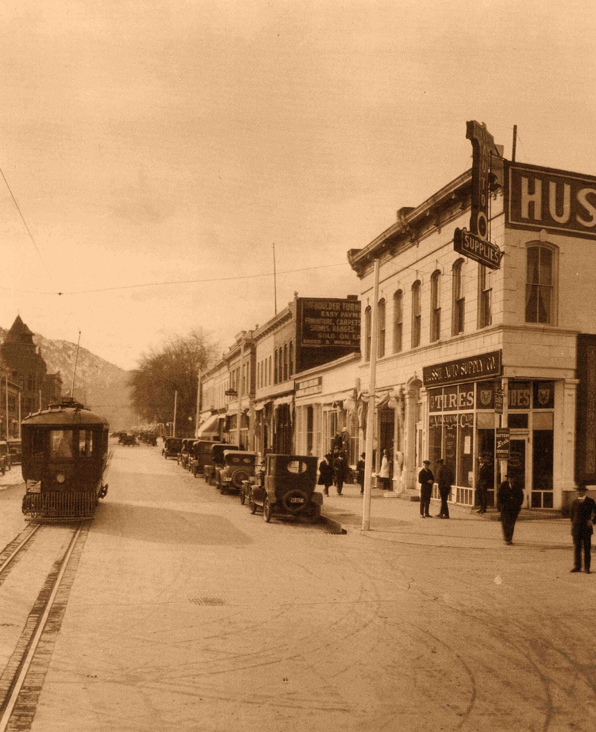 This photo is taken from the corner of 15th and Pearl Streets in Boulder, facing westward, in 1922. Thomas and Lulu Hussie owned Boulder Bicycle Company, first located at 1420 Pearl Street. By 1906-7 the business had become a bicycle and auto business. By 1908, it was known as Hussie Automobile Co. The address changed slightly over the years: 1442-48 Pearl (1911), 1442 Pearl (1914,1916), 1445 Pearl (1921, 1923). In 1923 Maurice T. Hussie, believed to be Thomas and Lulu’s son, was listed as the owner of the business. In 1926, Hussie Service Station was listed at 1505 Pearl Street.