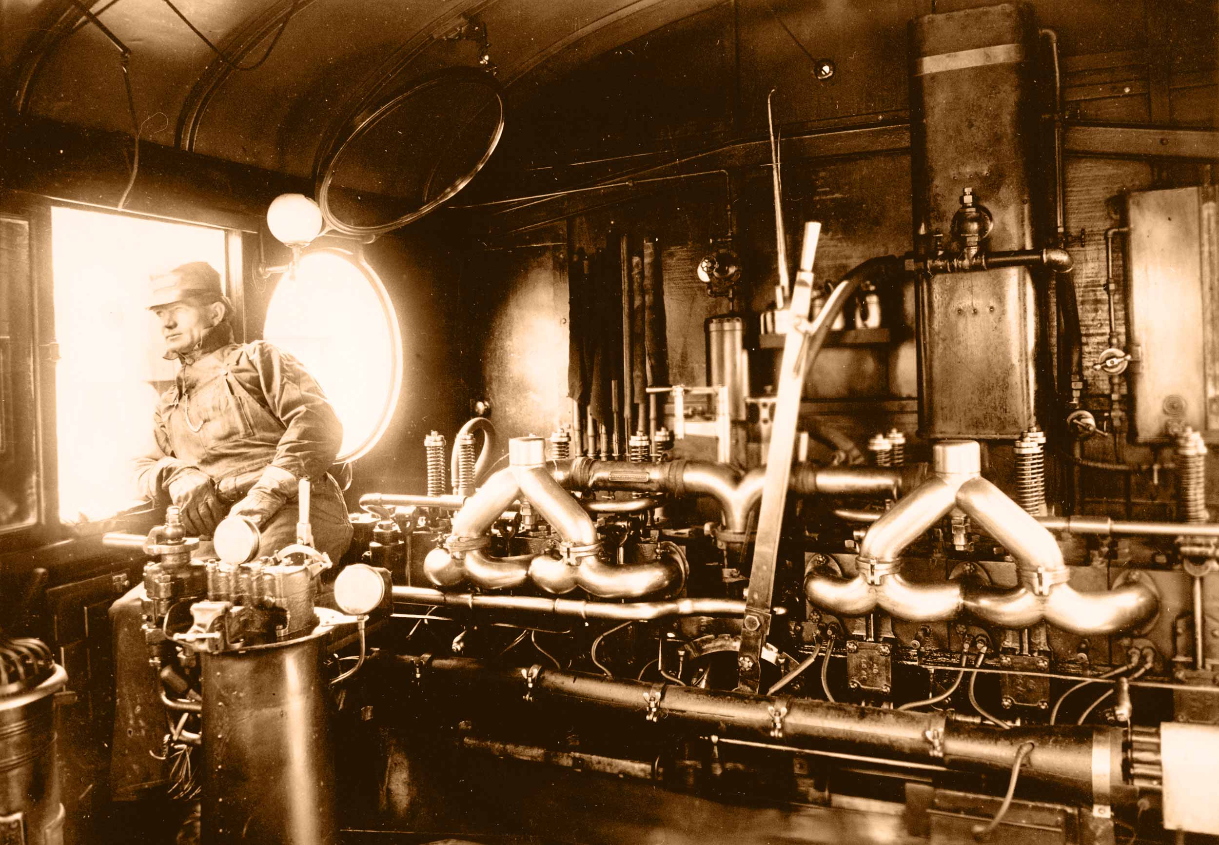 Interior of the Union Pacific Motor Car. On Nov. 1, 1909 the U.P. introduced this self contained forty-two passenger rail car on the Denver-Boulder route. The 78 foot long car was powered by a 6 cylinder gasoline engine.