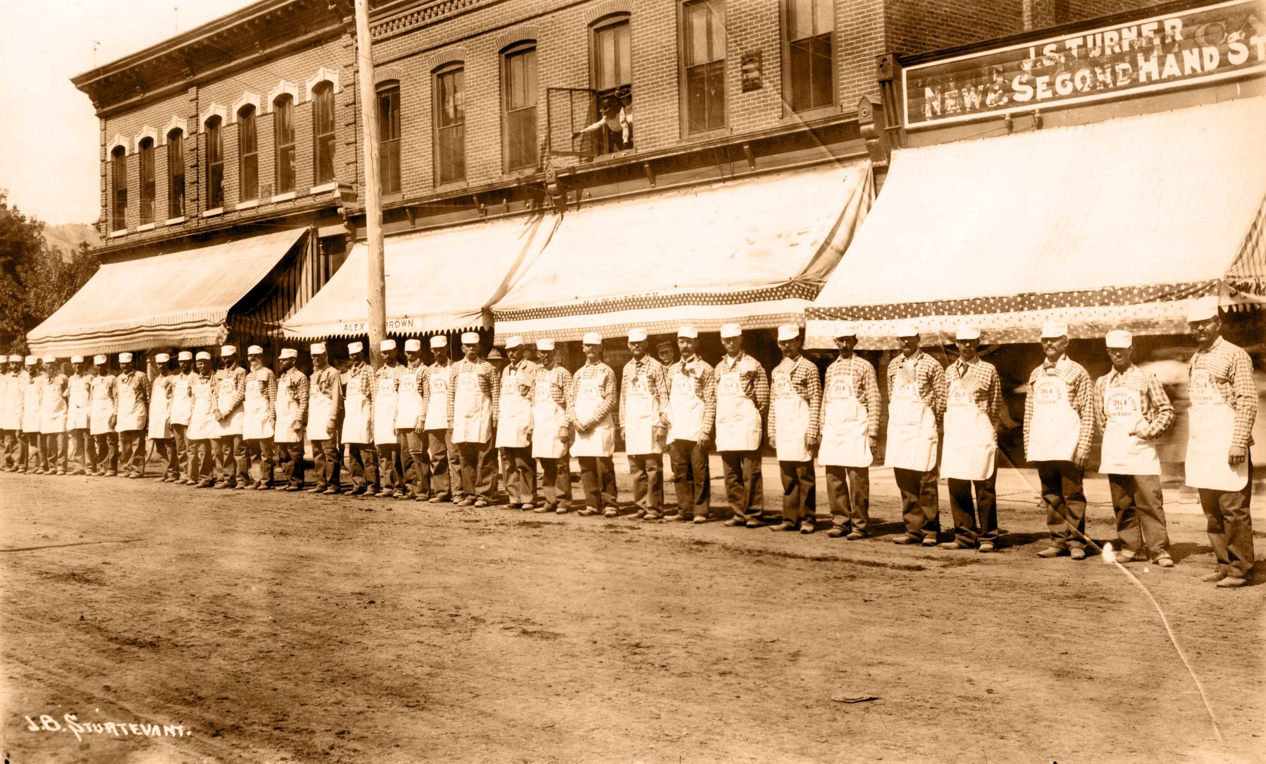 United Brotherhood of Carpenters and Joiners of America Local No. 264. Thirty-two men, wearing checked shirts, carpenter’s hats and aprons, standing in front of the businesses in the 1400 block of Pearl Street. Two women looking out of a open second floor window. Behind them is the J.S. Turner, New & Second Hand Store (1417 Pearl)