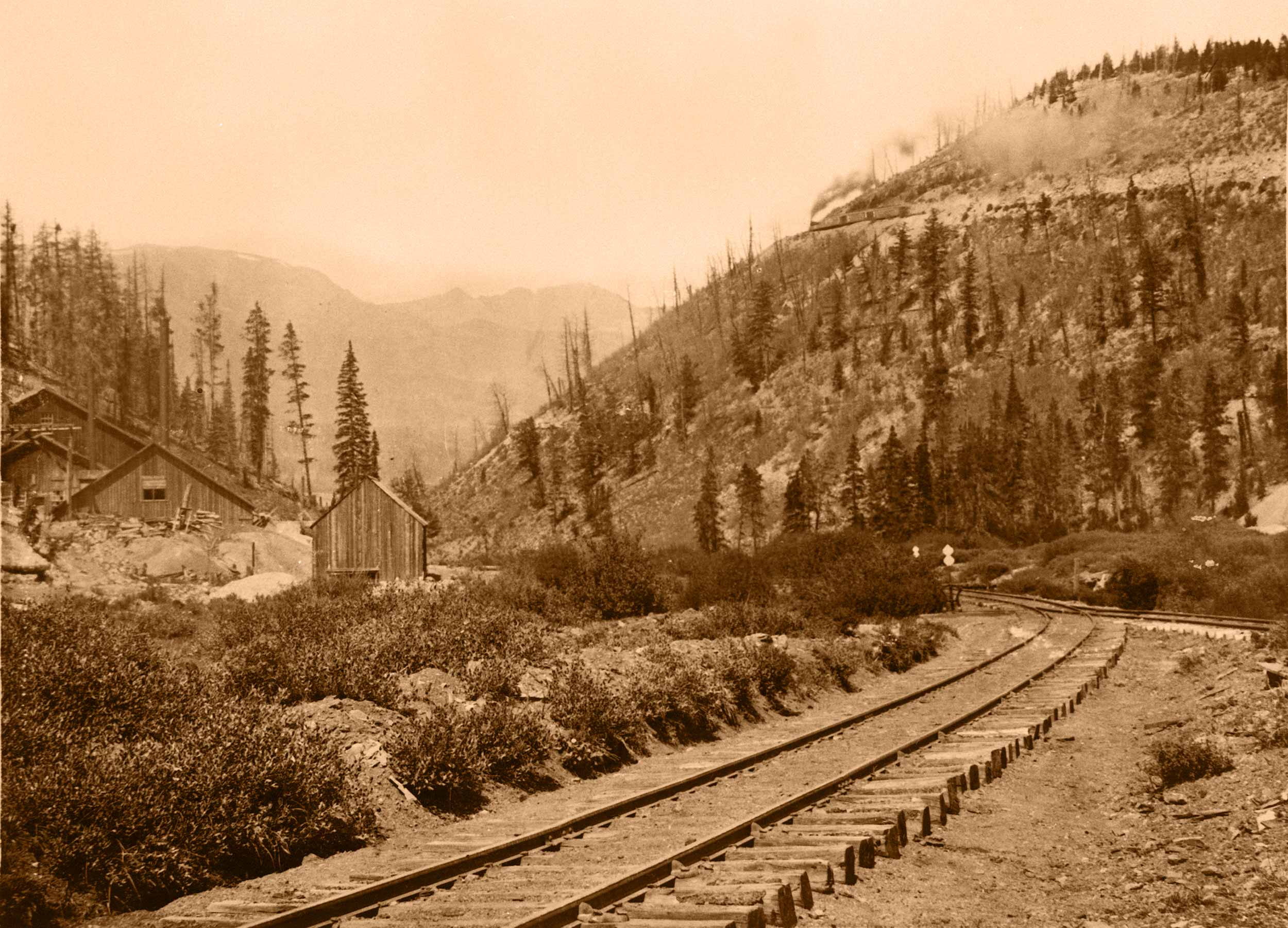 View showing the train on Barney Ford Hill in Breckenridge, Colorado.