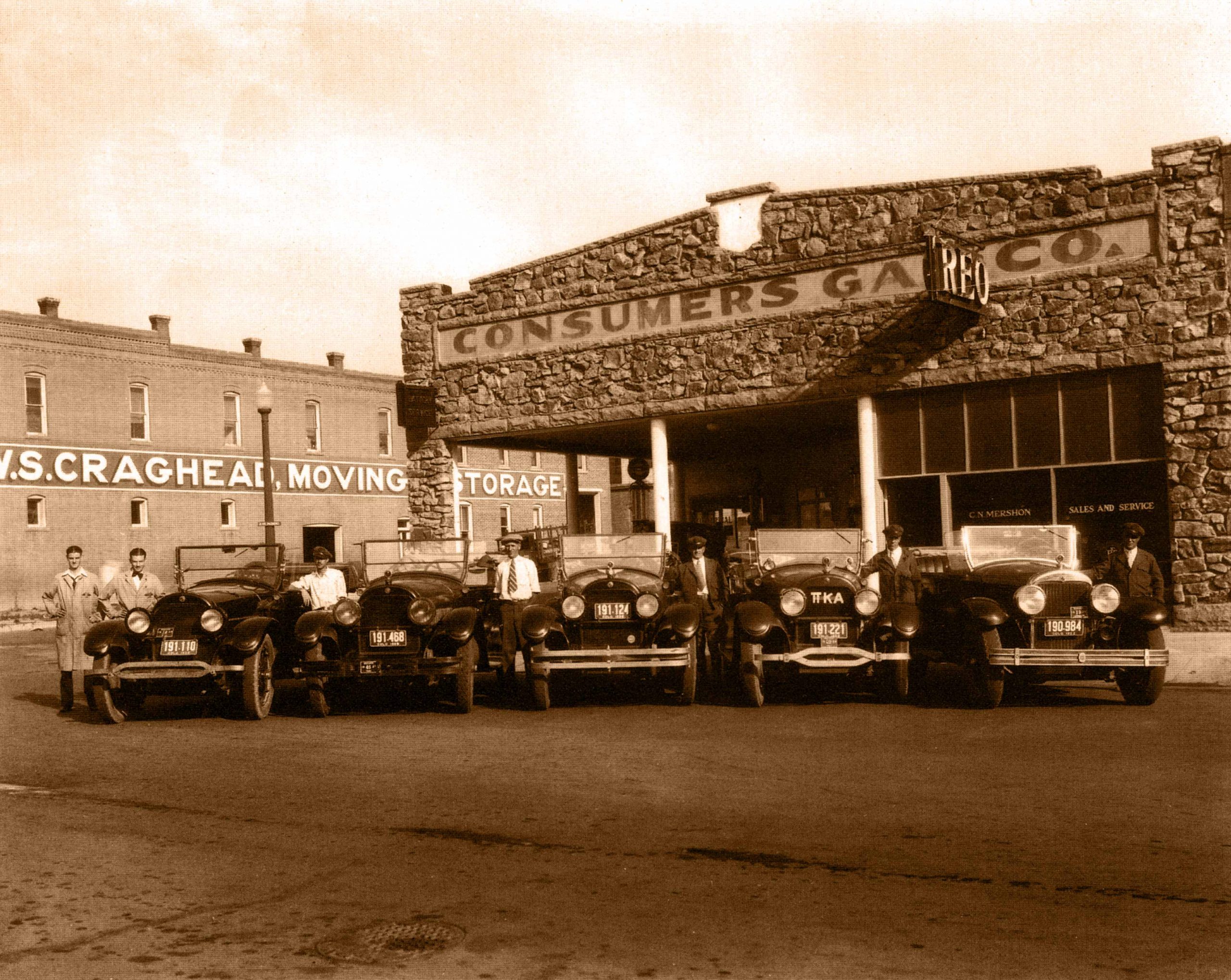 A view of the exterior of the Consumers Gas Company building at 1101 Walnut St. at 11th St., Boulder, in 1929. Seven men are posing with five automobiles that are parked in front of the garage. The Craghead Moving and Storage building is partially visible across 11th St. at 1901 11th St. C. N. Mershon was in charge of sales and service for Consumers Gas Site of the current Rio Grande restaurant.