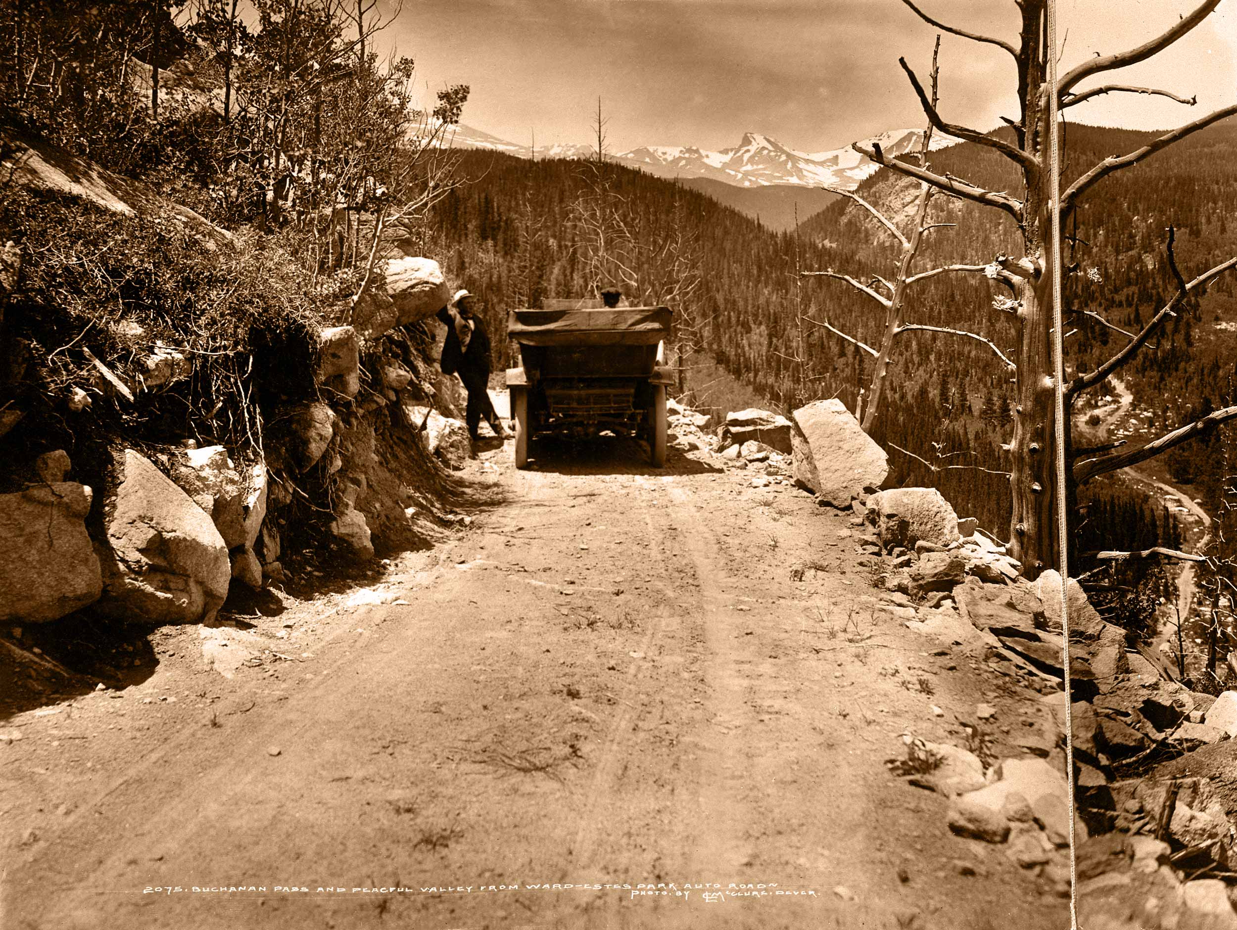 Photo taken on Buchanan Pass near Peaceful Valley from the Ward to Estes Park Auto Road. The road is now known as Peak to Peak Highway.