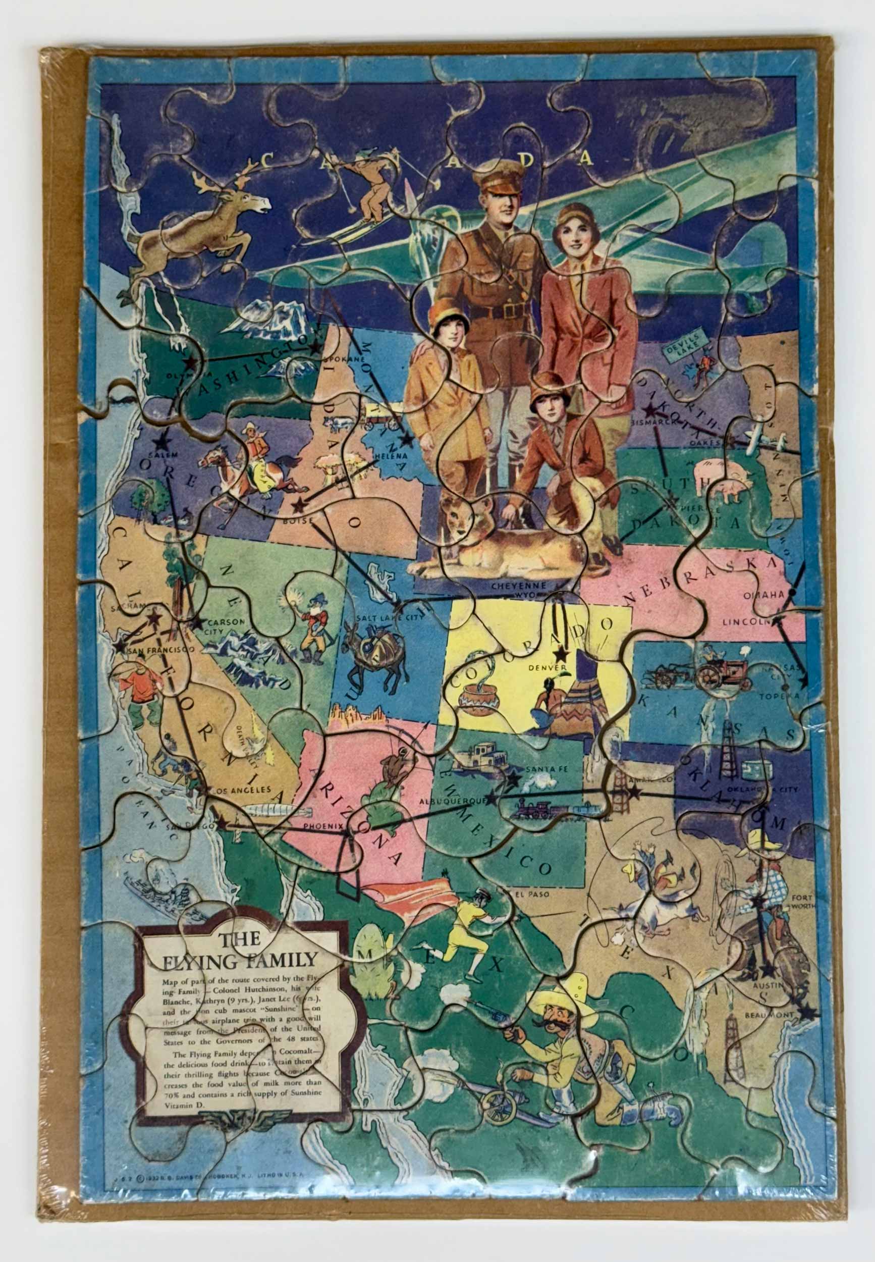 Travel back to the golden age of aviation with this 1932 jigsaw puzzle map featuring America’s original aviation celebrities—The Flying Hutchinson Family. Issued by the R.B. Davis Co. of Hoboken, NJ, this 65-piece puzzle map captures the spirit of adventure with colorful vignettes of scenes across the western United States. Originally offered as a promotional giveaway with every can of “Cocomalt,” a beloved enriched milk drink, this map was primarily made to advertise. The original brown envelope (included) highlights the era’s marketing style and is also collectible item.