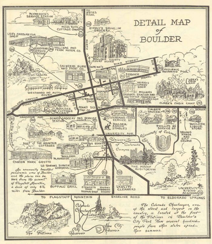 This reproduction map was part of a 1940 brochure that was “presented by the Resorts and Places of Business shown here, to help make your vacation more enjoyable.” The 1940 Detail Map of Boulder, created by cartographer C. H. Ruth, is a striking pictorial representation of Boulder. Bold black lines trace U.S. and Colorado state highways, and points of interest all throughout Boulder are shown in amazing detail. This map has a large illustration of the famous Flatirons peaks, and the University of Colorado, as well as information about Chautauqua. Alongside the roads, the map is filled with detailed illustrations of tourist lodges, service stations, and mountain cabins, and much more. On the original map, the verso featured detailed insets of town centers like Northern Colorado, Loveland, and Grand Lake, and more.