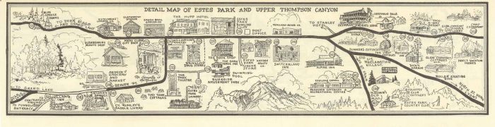 This reproduction map was part of a 1940 brochure that was “presented by the Resorts and Places of Business shown here, to help make your vacation more enjoyable.” The 1940 Detail Map of Estes Park and Upper Thompson Canyon, created by cartographer C. H. Ruth, is a striking pictorial representation of the region’s road network and tourist economy just before the interstate era. The map focuses on key transportation routes traversing through Estes Park and beyond. Alongside the roads, the map is filled with detailed illustrations of tourist lodges, service stations, and mountain cabins, and other points of interest. On the original map, the verso featured detailed insets of town centers like Boulder, Loveland, and Grand Lake, including a unique illustration of the University of Colorado campus.