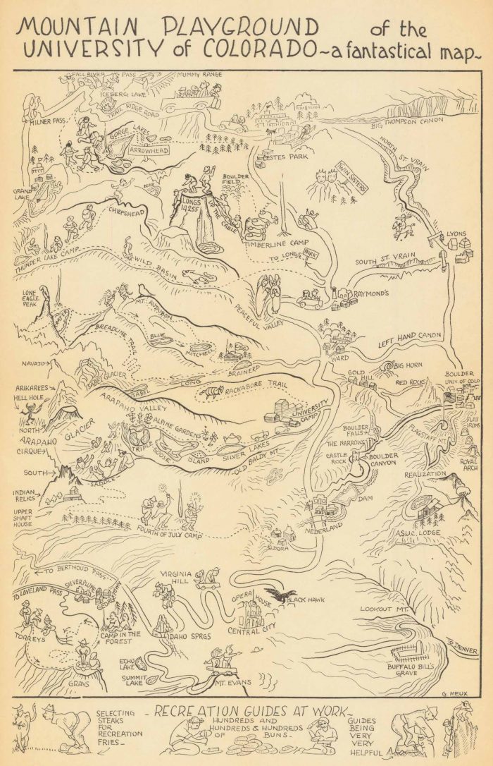 The 1940 pictorial map “Mountain Playground of the University of Colorado – A Fantastical Map” by Gwendolyn Dufill Meux is a colorful, imaginative depiction of the mountainous region around Boulder. Filled with whimsical illustrations, the map features snow-capped peaks, winding trails, wildlife, skiers, hikers, and blending real geography with playful fantasy. Key landmarks include the University of Colorado campus, alpine cabins, and popular recreation spots like skiing areas and hiking routes. Meux’s detailed, artistic style transforms the landscape into a lively, storybook-like setting that highlights the area’s natural beauty and outdoor spirit.