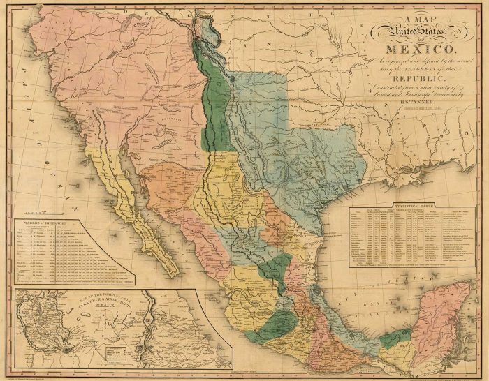 This information-rich 1846 map of what was Mexico shows the different states of Mexico along with their area in square miles, their populations, their produce, and their capitals. In present-day, this map covers what is California, Arizona, New Mexico, Nevada, Utah, Texas, Oklahoma, and Colorado. The map also contains a table of distances. In the inset, the map highlights the roads to and from Vera Cruz & Alvarado to Mexico. It shows the various colonies throughout Texas, lakes, rivers, mountains, and islands. Native American settlements are also displayed in great detail.