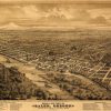 Panoramic city maps, popular at the turn of the century, depicted U.S. towns from the perspective that came to be known as bird’s-eye maps. These non-photographic old maps, depicted from oblique angles, showed street patterns, buildings and the predominant surrounding landscape in perspective. Going to great lengths to make these maps, artists would often climb surrounding hills or trees, sometimes even building platforms from which to achieve the bird’s eye” perspective. They also used to take rides in hot air balloons in order to get the proper perspective. To bolster sales of these old panoramic city maps, the artists would often choke town harbors full of ships, include proposed building developments and depict a vivacious, bustling industry. Historically interesting and beautifully drawn, it is no wonder these old panoramic city maps are making a popular comeback. Bring the spirit of your town’s history back to life with these stunning old bird’s-eye maps.”