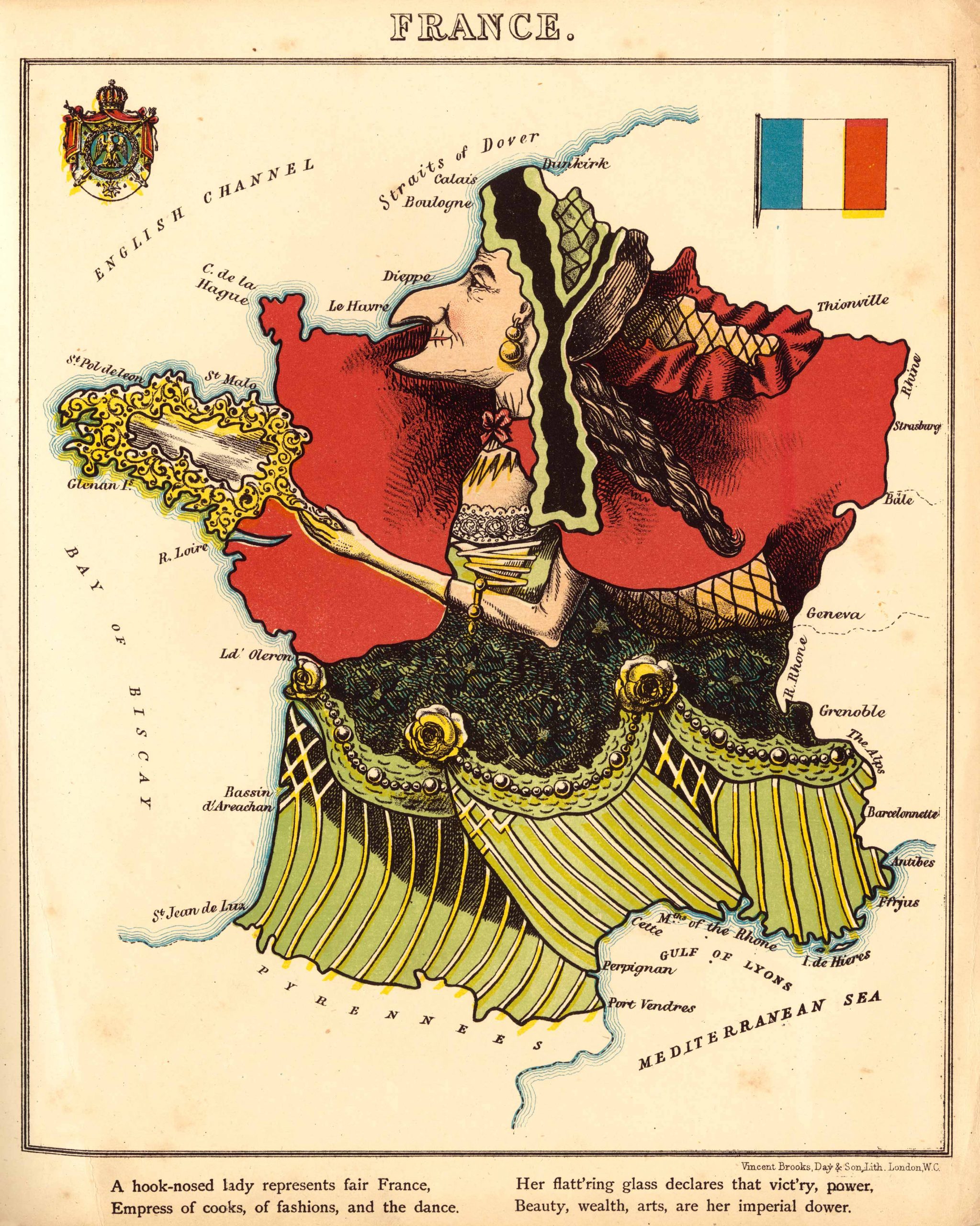 This 1868 map of France by Elizabeth Lancaster and William Harvey was originally published in Geographical Fun: Being Humourous Outlines of Various Countries.Drawn by a fifteen-year-old Victorian girl using the alias Aleph, the atlas contained twelve maps of European countries, each represented with a character and satirical verse. The book was created to help spur student interest in geography.