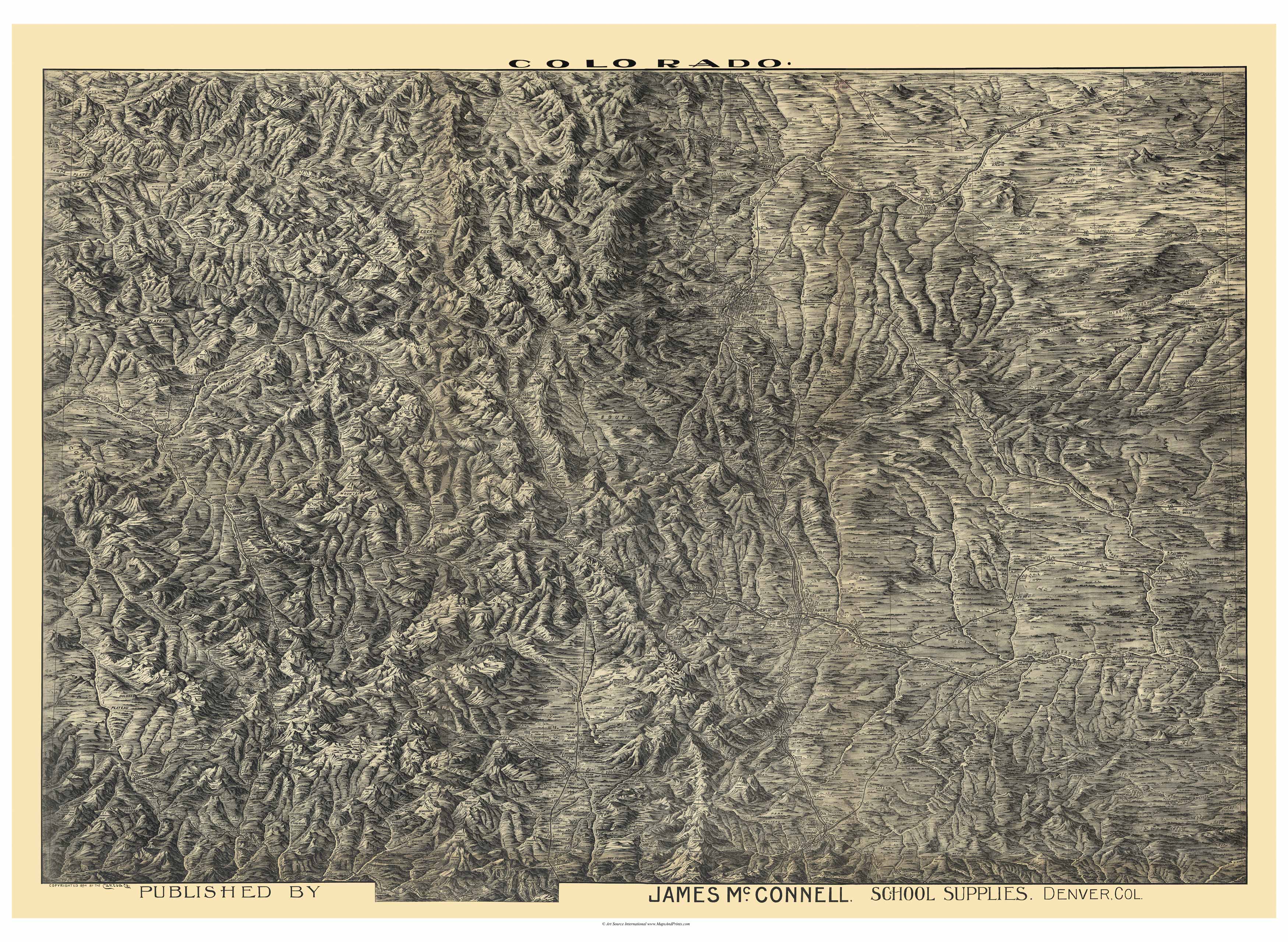 This map was created in 1894 by James McConnell School Supplies of Denver. It artistically shows shaded relief to depict Colorado�s mountains. It is rich with detail and shows at least 200 towns that no longer exist in the state. Many of these towns became victims of mining busts in the mountains, many of them abandoned during droughts on the eastern plains, and many of them depressed by the rise of the automobile culture. During the height of the railroads, Colorado needed tiny towns in every settled area to provide people with food & supplies – but as roads and private cars became more widely available, many of these small towns became unnecessary and faded into obscurity. Original McConnell maps that measure roughly four feet by six feet are sometimes rescued from old schoolhouses that are collapsing or being torn down. These enormous, original rolled maps, were glued to a linen canvas and designed to scroll down over a school chalkboard. They once provided Colorado�s children an opportunity to study the states mining camps, towns, rivers and mountains. And they now provide map lovers & historians a fascinating chance to look into Colorado�s past. We sold the original of this map in 2002.
