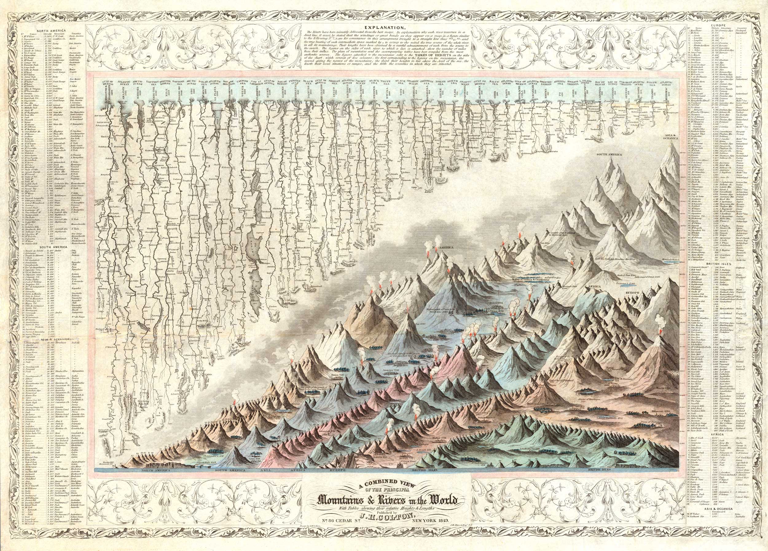 Art Source International is proud to offer this reproduction map from 1849. This is the first separate issue edition of Colton’s famous mountains and rivers map which went through many later editions in Colton’s world atlases. These maps have the signature 3/4″ Colton border surrounding each map. The Colton firm refused to compromise quality, choosing to compete for sales in the finer quality international market rather than the inexpensive domestic one. Because of this, all maps were engraved by steel plates rather than by wax engraving which was the most common method used at this time. ‘