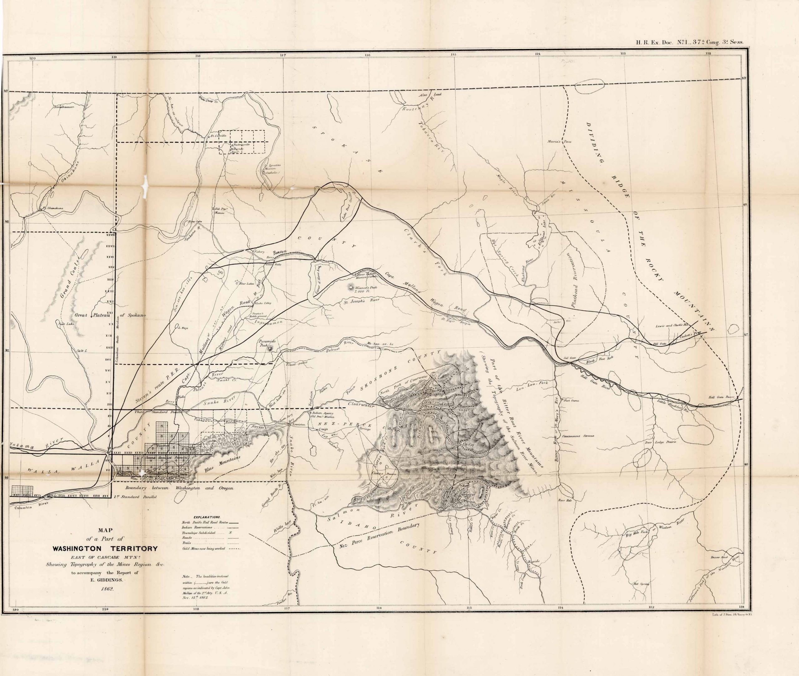 A nicely engraved, detailed map of Washington territory. Explores routes are shown as well as Indian Reservations, Military Forts, and a number of ghost towns. Walla Walla is shown in with easy survey notations. This is a beautiful map of Washington Territory East of the Cascades.