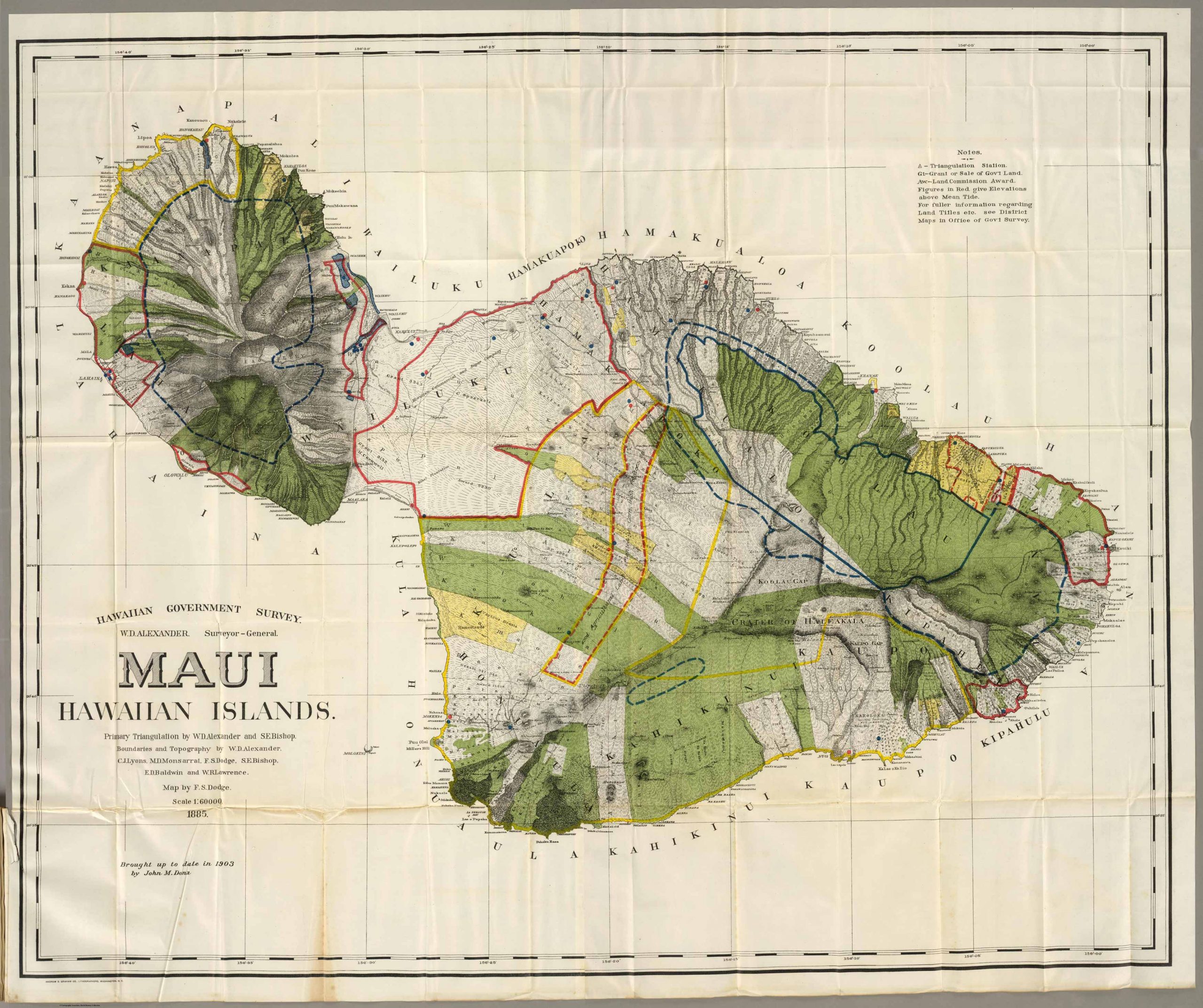 This is a map of the Maui in the Hawaiian Islands, by the Hawaiian Government Survey with W.D. Alexander as the Surveyor – General. Primary triangulation done by W.D. Alexander and S.E. Bishop. Boundaries and topography by W.D. Alexander, C.J. Lyons, M.D. Monsarrat, F.S. Dodge, S.E. Bishop, E.D. Baldwin and W.R. Lawrence. Map by F.S. Dodge. This map is scaled at 1:60,000 and was originally published in 1885, but was brought up to date in 1903 by John M. Donn. This beautiful, vibrant map showcases natural features such as peaks, valleys, bays and more. Some of these features include: Crater of Haleakala, Lahaina, Kahului, Hanakaoo, among many others.