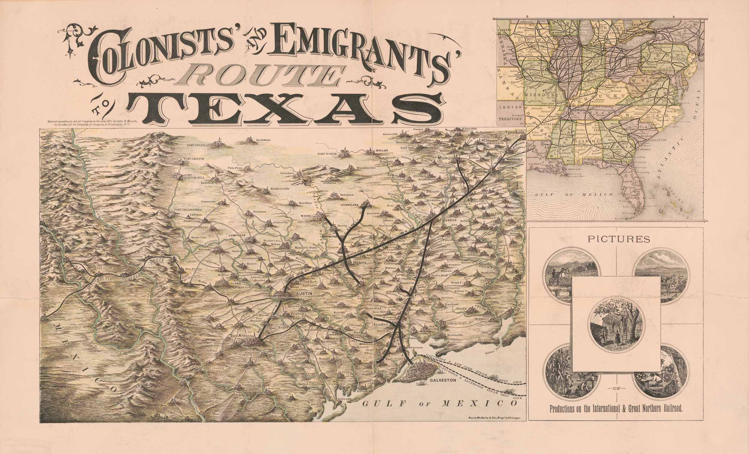 Map showing colonists’ and emigrants’ route to Texas. Created by John Z. Miller and Rand McNally & Co. in 1877. Inset map of the Great Northern Railroad.