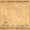 This map of Boston shows the area as it was in 1869. It names key streets, government buildings, notorious residences, burial grounds, railroad depots, wharves, the Fort Hill area, theaters, and more. The map contains seven different illustrations of ships along with who owns them and their destinations. In the border, the map advertises numerous local businesses, including book and printing shops, parlor furniture dealers, photographers, chocolate stores, mill supplies, and liquor stores.