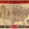 Across top of map: Union Pacific Railway and connections. County map of the United States showing relief by hachures, drainage, cities and towns, and the railroad network with emphasis on the main line. Scenic illustrations border the map.