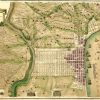 This 1802 map of Philadelphia by Charles Varle shows a general outline of the city complete with neighborhood grids, terrain information, roads, ferries, and the names of various farms.The key shows building locations referenced by letter: churches, the market, the theater, the library, and the bank, and the university are just a few among the buildings listed. In the insets, illustrations of the library, the bank, and the State House are shown.