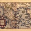 Graeciae Universae (Greek Empire). Greece, which at one time was as it were the mother and nurse of all good learning and disciplines, a rich and wealthy country and one which by its valour and magnanimity was Empress and Prince of the better half of the world, has at this day fallen to a state (such is the fickleness and inconstancy of fortune, which turns all things upside down) that there is no part of it or it is either subject to the Turks and enthralled to slavish servitude, or else it is under the command of the Venetians, or tributary to them.” from text on back of map translated by Marcel van den Broecke”
