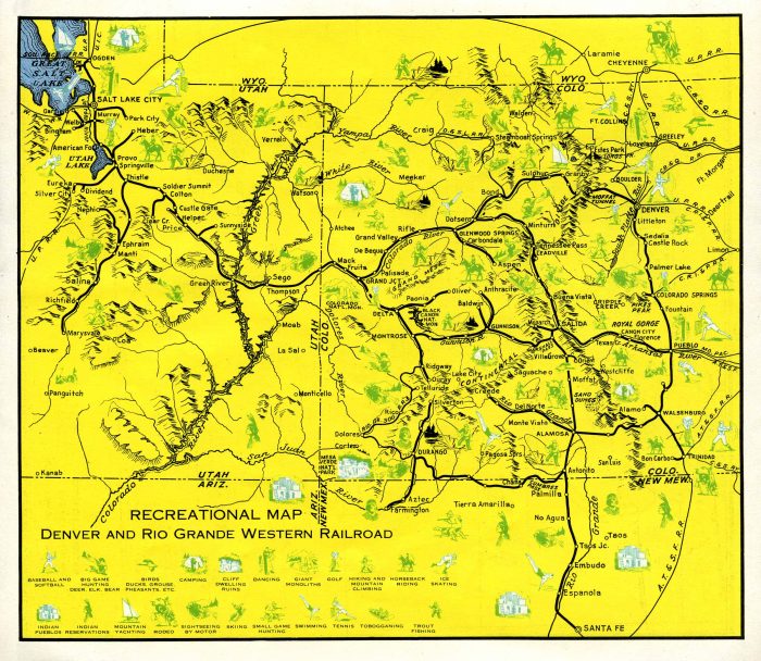 This brightly colored pictorial map was originally part of a 1935 folding travel map published by the Denver and Rio Grande Western Railroad. It highlights the Denver and Rio Grande Western Railroad stops, as well as peaks, points of interest, roads, wildlife and much more. This map focuses on the various recreational opportunities in Utah and Colorado – sports, hunting, camping, skiing, rodeos, native american historic sites, hiking, horseback riding, and much more.
