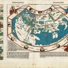 One of the earliest relatively obtainable incunabula world maps. It is a remarkable record of late Medieval cartography combining the outdated concepts of Claudius Ptolemy with the Biblical tradition, which here depicts the world divided between the three sons of Noah. The fine border and verso vignettes depict fabled mythical beasts and creatures believed to exist outside and beyond Christendom.” This map was originally done in 1493 in Hartmann Schedel. “