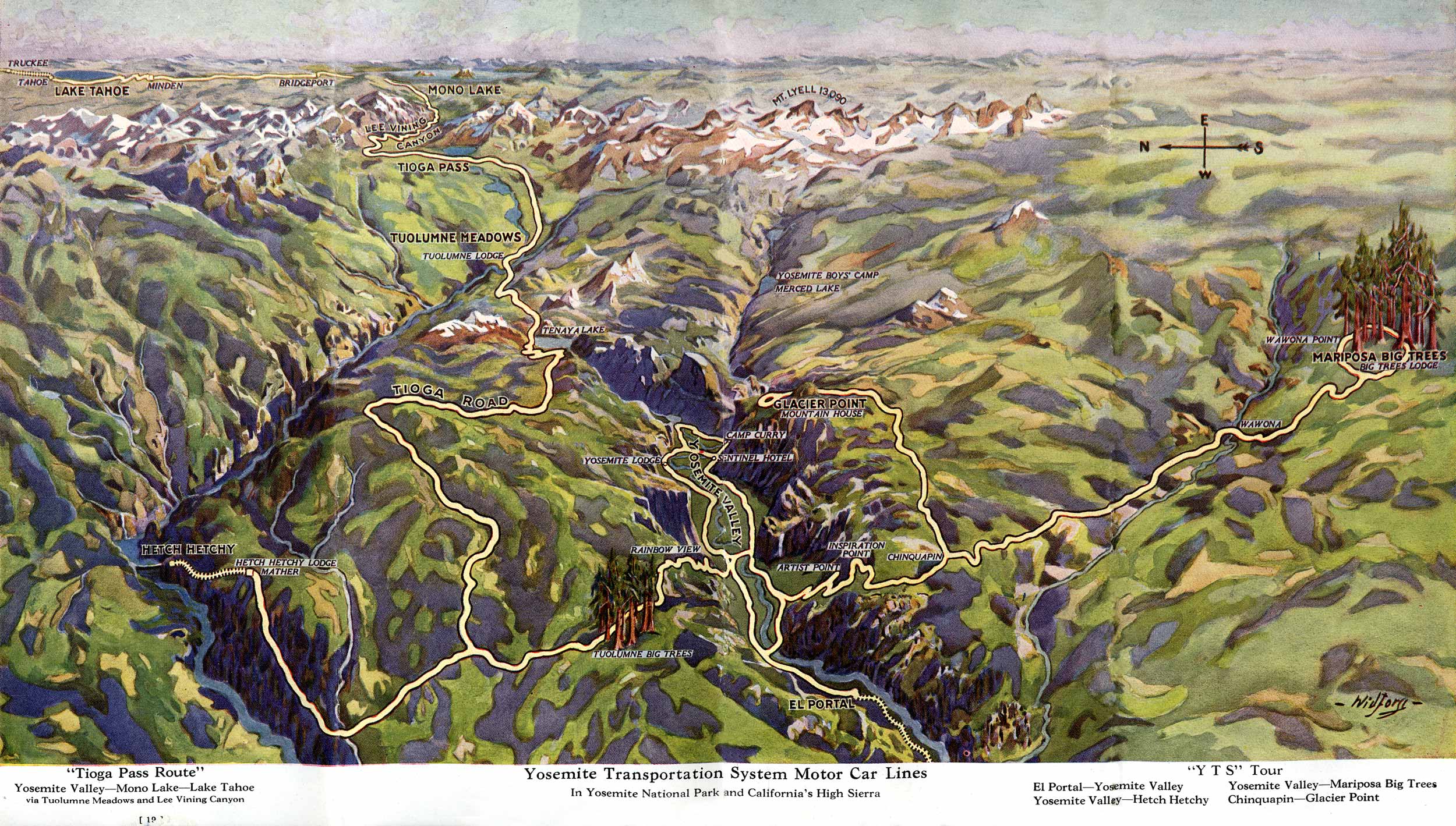 The map titled “Yosemite Transportation System Motor Car Lines in Yosemite National Park and California’s High Sierra – Tioga Pass Route – ‘YTS’ Tour” illustrates a historic network of motor car routes used to transport early 20th-century tourists through Yosemite and the surrounding High Sierra. Centered on the scenic Tioga Pass Route, it highlights key destinations such as Yosemite Valley, Tuolumne Meadows, Glacier Point, and Wawona, as well as connections to the park’s eastern entrance via State Route 120. The map likely includes topographical features, historic lodges, and camps, serving both as a travel guide and a promotional piece celebrating the era of early automobile tourism in one of America’s most iconic national parks. The Yosemite Transportation System (YTS) and its motor car tours were most active during the 1920s to the 1940s.