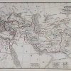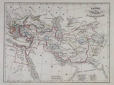 E. V. Monin made this 1822 edition of the “Atlas Universel de Geographie Ancienne & Moderne en 42 Cartes” in Paris. Bright colors highlight regions on these small, but detailed maps. This hand colored, French map illustrates the land conquested by Alexander the Great. The names of regions, important cities, mountain ranges, lakes and rivers are identified. These old maps are in very good condition with unique outline coloring.