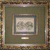 This is a very rare, double hemisphere map of the world. In North America, California is shown as an island with the Jesso landmass stretching nearly to Japan. This landmass is not included on the Americas map, but it is very prevalent on the Asian map. The cartography in Africa reflects the Ptolemaic source of the Nile in the twin lakes south of the equator, and the political divisions are well represented. Australia is still missing its east coast, but the Dutch discoveries are shown in Tasmania and New Zealand. At the South Pole there are still remnants of Terre Magellanique Australe et Incogneue. This map has an exquisite frame job on it. Its framed with a beautiful silver decorative frame, a sage/tan outer mat, two decorative fillets and gorgeous blue gray inner mat. It also has a plaque with the mapmaker’s name and the date. The size of the map is 7 inches x 6 inches.