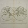 Rarely have we seen such a unique world map from this period. This intricately engraved French map shows us the continents and major topography, but doesn”t stop there. This map has so advanced as to show us how mountain ranges and land crests continue around the globe. So a mountain range that stretches across southern Africa, continues as an underwater elevation through the sea and connects again as a mountain range on the coast of South America. This is a fascinating way of analyzing the world, but there are other features that capture our attention. As there were continents yet to be explored, this map still shows primitive views of parts of Australia and North America. This is a very rare map and is in very good.
