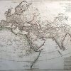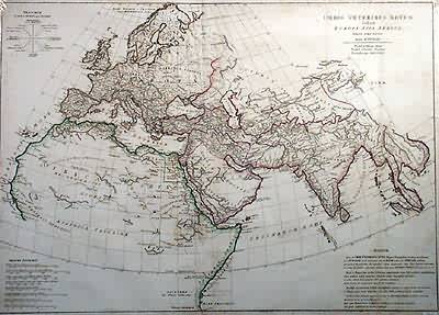 This beautiful hand colored map was made in 1816 by D”Anville. Europe, Asia, and Africa are illustrated on this map. Details include the names or regions and important cities, as well as illustrations of mountains, rivers, and lakes.