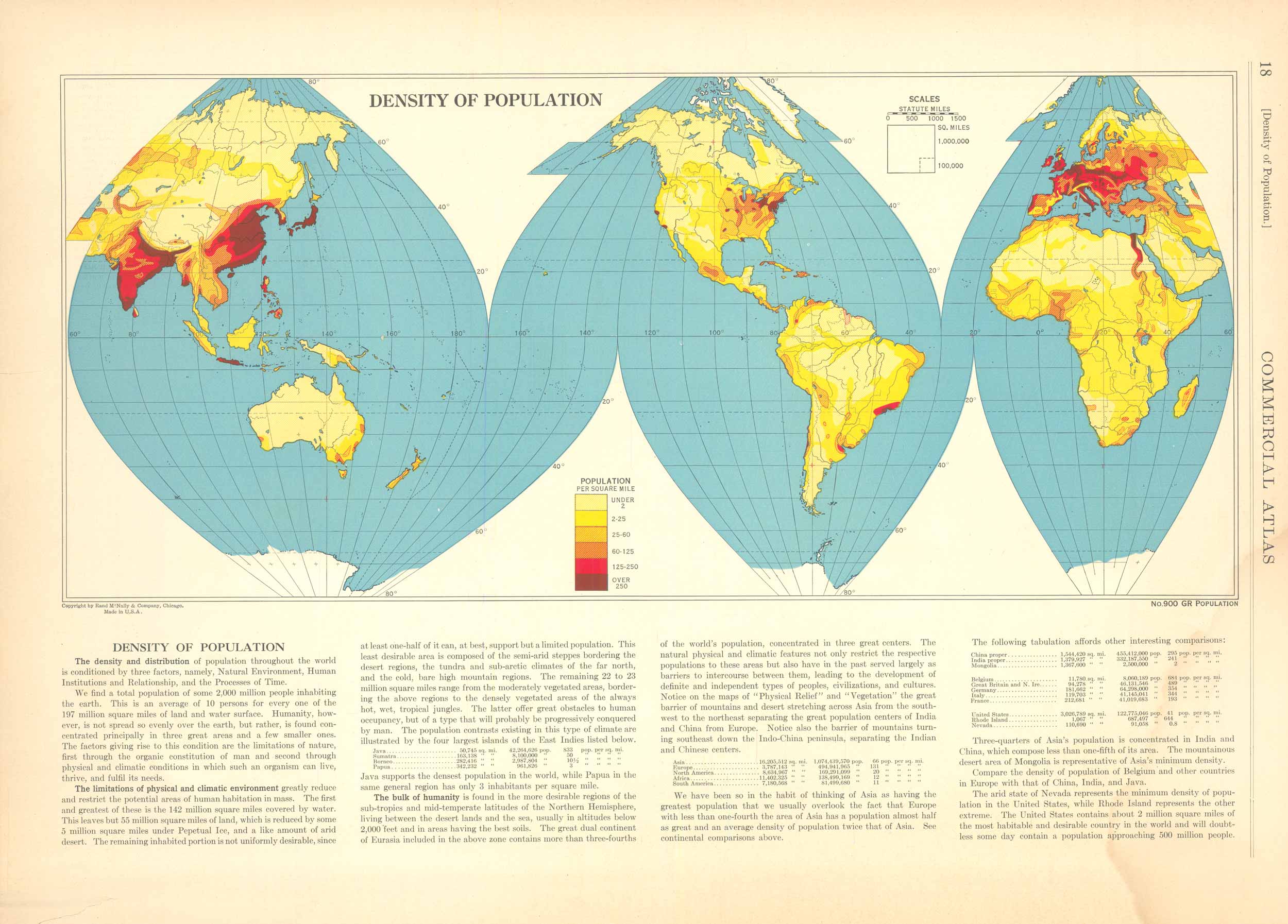 Rand McNally & Company, still a major name in map publishing to this day, began as a small print shop opened in Chicago in 1856 by William H. Rand. The shop originally printed guidebooks and directories. In 1858, Rand hired Andrew McNally who was later to become a partner. Within the next few years, the shop got into the railroad business by starting to print railway tickets and schedules, a key step in the development of the company. The ticket printing led to the publishing of railway guides, and by 1872 Rand McNally and Company had the capacity to publish maps. This map of the Density of Population came from Rand McNally’s Commercial Atlas. A highly successful run of atlases that lasted over a decade. These maps were primarily used by business, because of their accurate listing of railroads in operation as well as tables of statistical information.