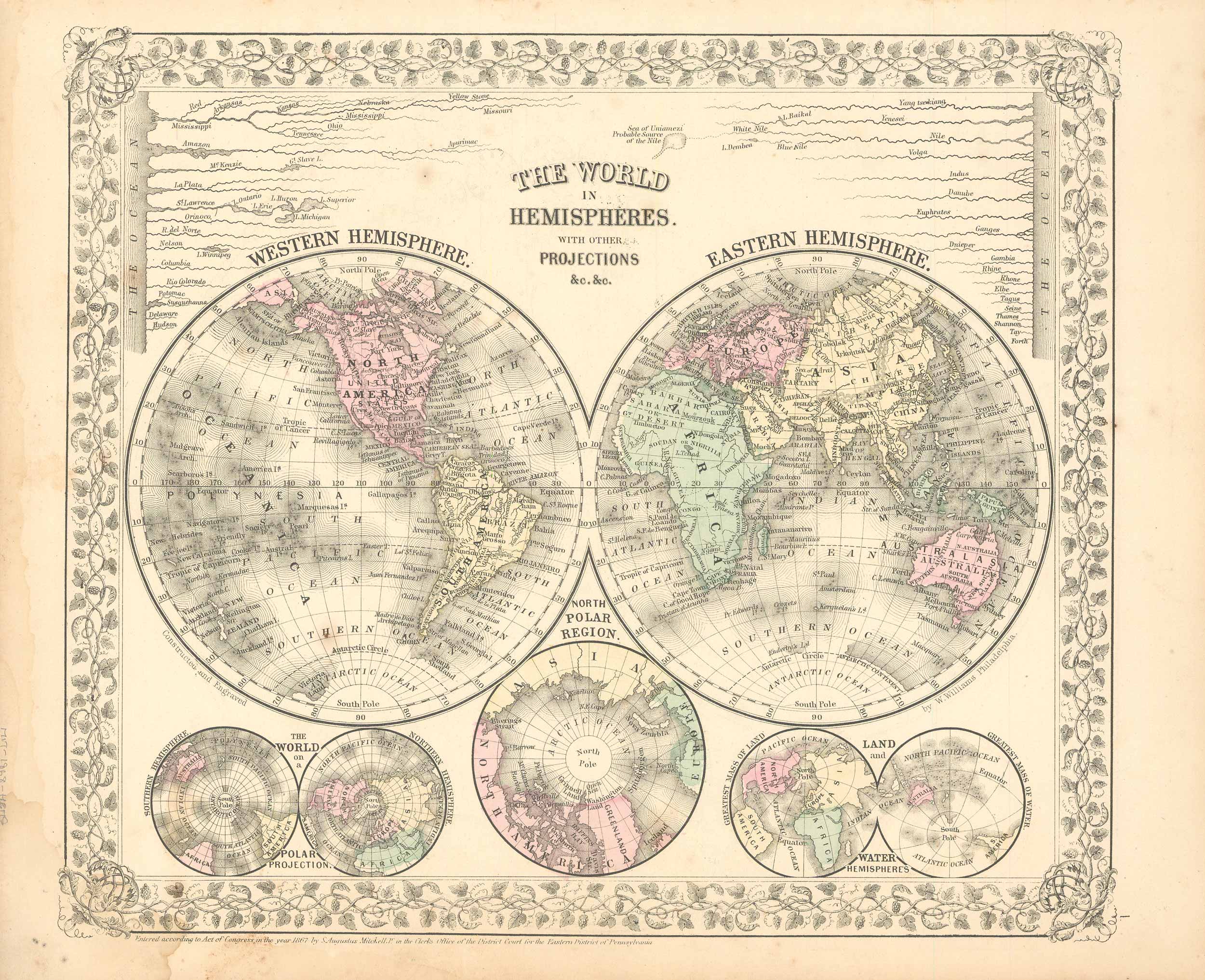 This hand colored map was made for “Mitchells New General Atlas” published in 1868 by S. Augustus Mitchell, Jr. This is a stunning double hemisphere map. Also shown are the major rivers of the world, as well as five additional smaller hemisphere maps of the poles and other regions. Hemisphere maps are getting harder to find. The pastel coloring in this atlas is very beautiful and more muted than typical.