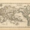 This hand colored map was made by Adam and Charles Black for “Blacks General Atlas” published in 1841. The world according to Mercator’s Projection is illustrated on this map. Details include the names of countries and many cities, and illustrations of rivers, lakes, and mountains. Regions are distinguished by pink, yellow, blue, and green outline color which is well maintained for the age of the map. The impression of the press used to engrave the map is still visible.