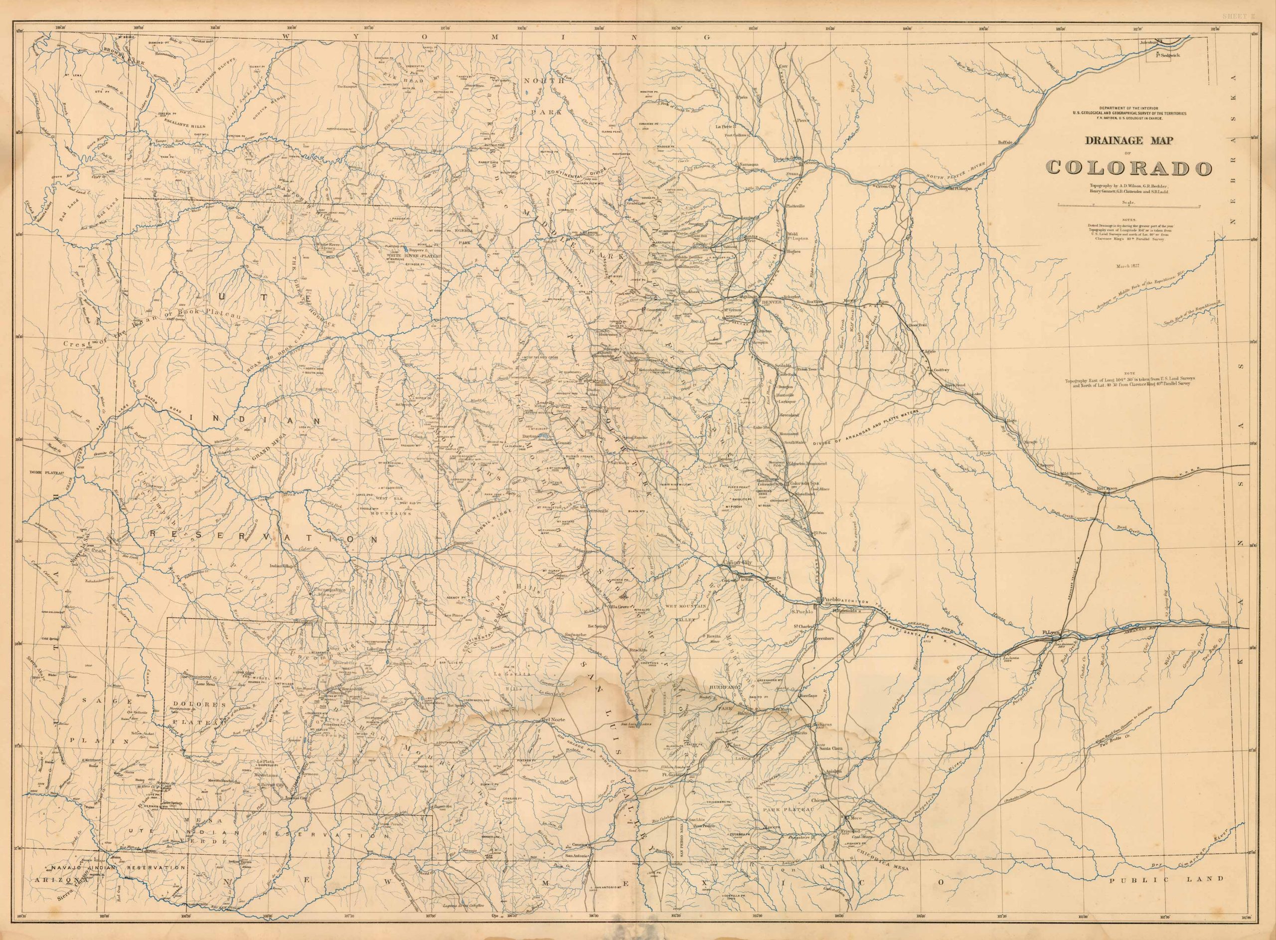 Drainage Map of Colorado by the Department of the Interior U.S. Geological and Geographical Survey of the Territories, F.V. Hayden as the U.S. Geologist in charge. This detailed map points out many man-made and natural features such as creeks, rivers, mountains, cities, reservations, ruins, farms, cliffs, plateaus, and regional areas among others. Included are notes that explain drainage trends and the topography seen on the map. This map was originally printed in March of 1877.