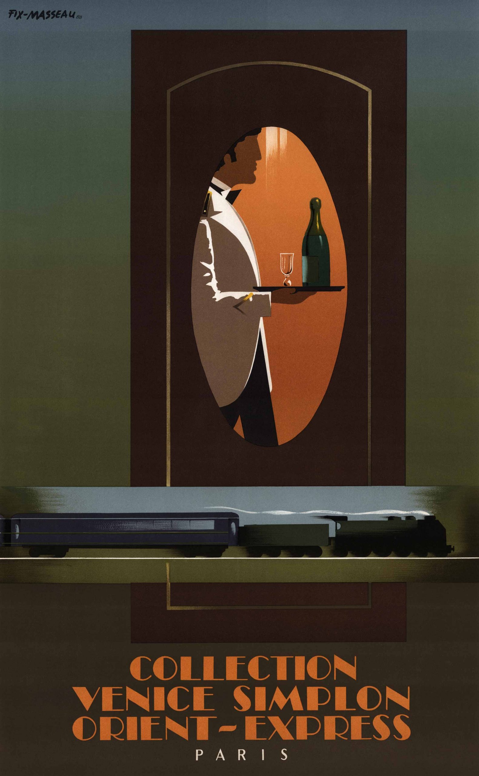 Collection Venice Simplon Orient-Express, Paris. This piece of artwork was done by Pierre Fix-Masseau in 1983. The Venice Simplon Orient Express is highly considered to be Europe’s grandest luxury train. This train first launched in 1982 after the owners came into ownership of the Belmond Hotel Cipriani and wanted to create a luxury way to carry travelers to Venice in high-style.