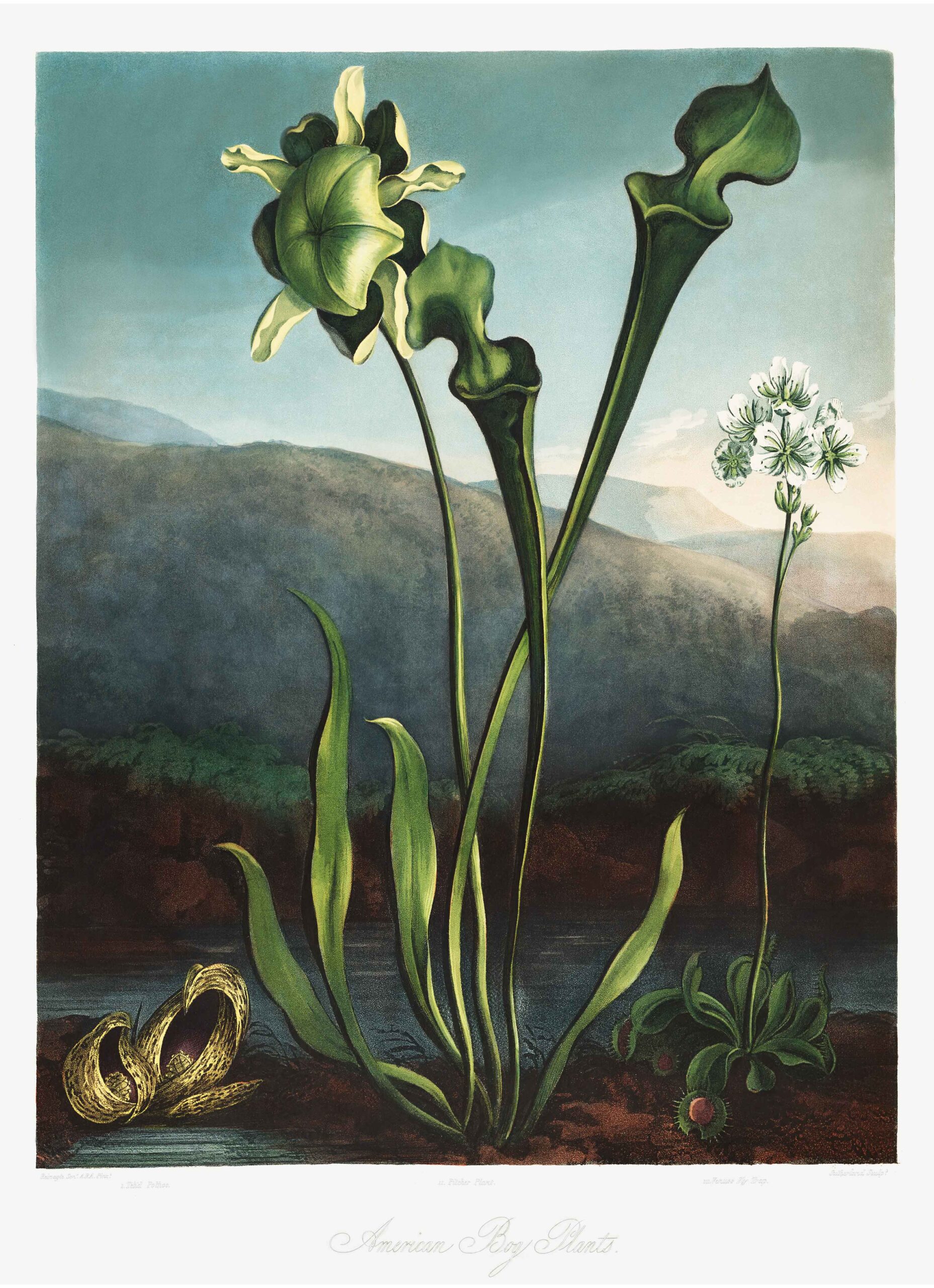 A reproduction from Robert John Thornton’s “The Temple of Flora.” These images depict flowers in epic and unusual settings. Interwoven amongst the images are various descriptions, histories and poetic odes regarding the flowers featured. The first plates were engraved by Thomas Medland in May 1798 from paintings by Philip Reinagle. Between 1798 and 1807 they produced a total of thirty-three colored plates, engraved in aquatint, stipple and line. Others engravers included Joseph Constantine Stadler working from the painting of Peter Charles Henderson.