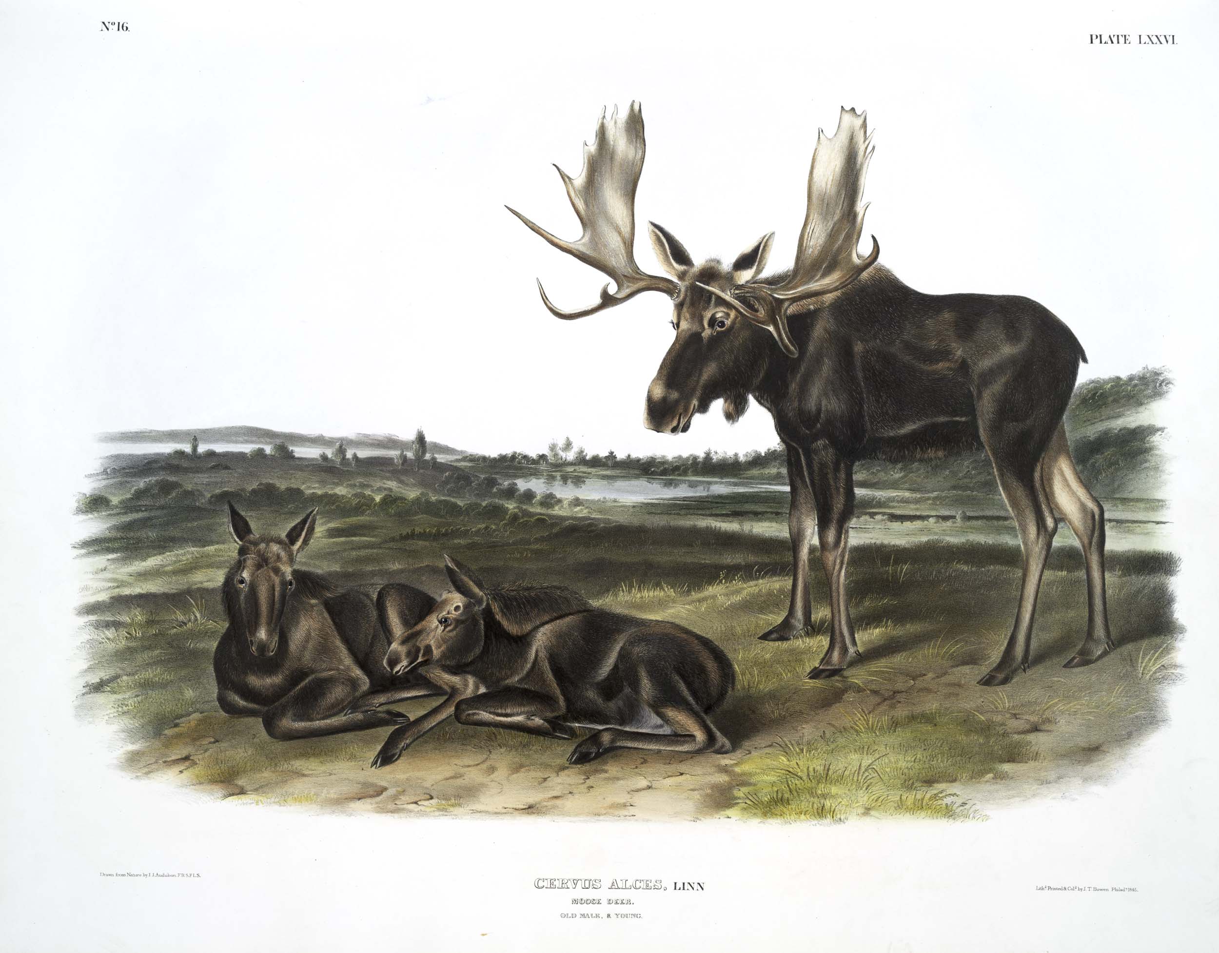 Giclee reproduction of Audubon’s famous Moose. This print features an old male Moose and his young.