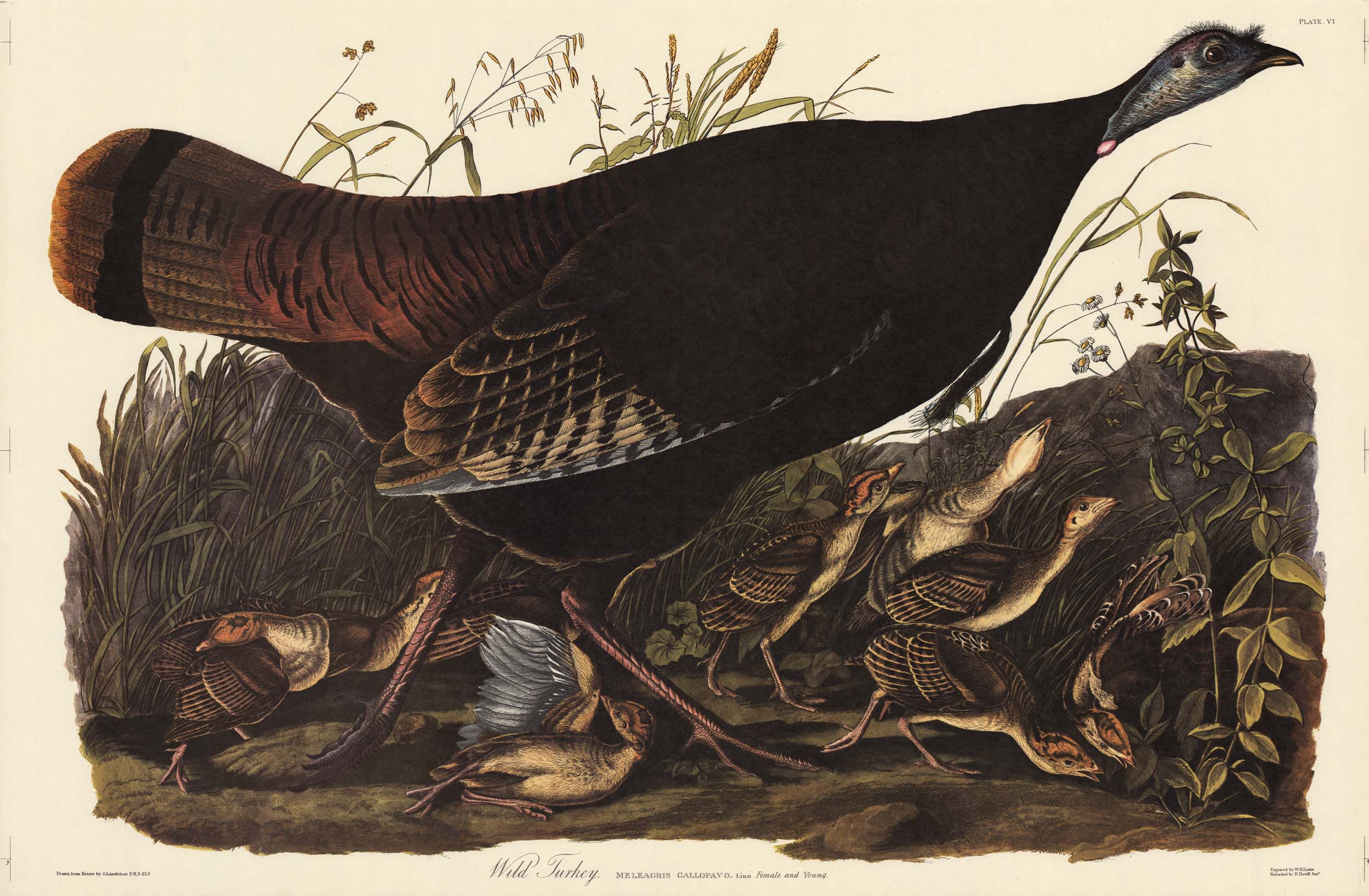 Giclee reproduction of Audubon’s famous Wild Turkeys. This print features a female turkey and her young.