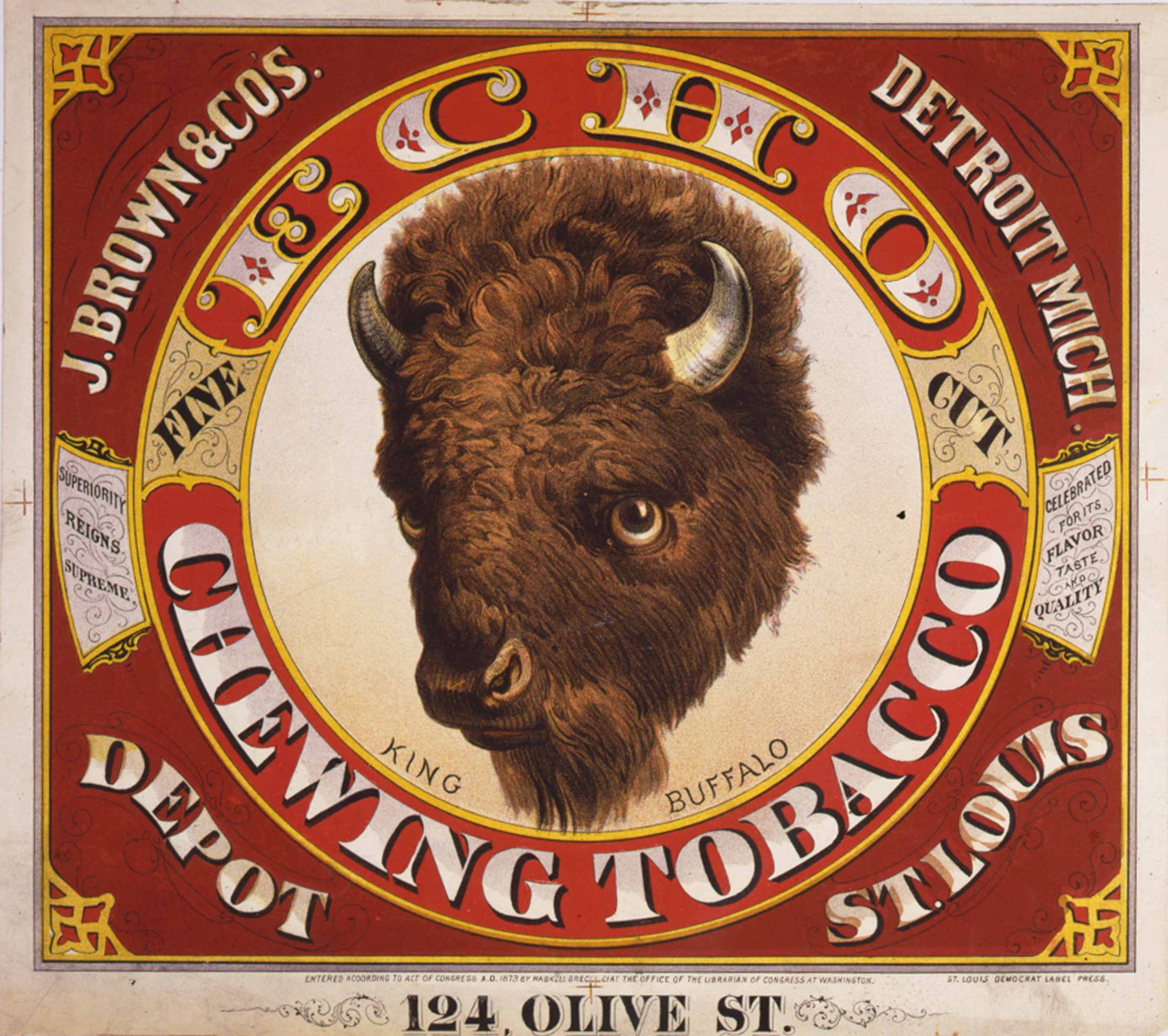 Echo Chewing Tobacco Vintage Print Ca. 1873. Tobacco label for J. Brown & Co. of Detroit, Michigan, depot St. Louis, showing the Head of a Buffalo.