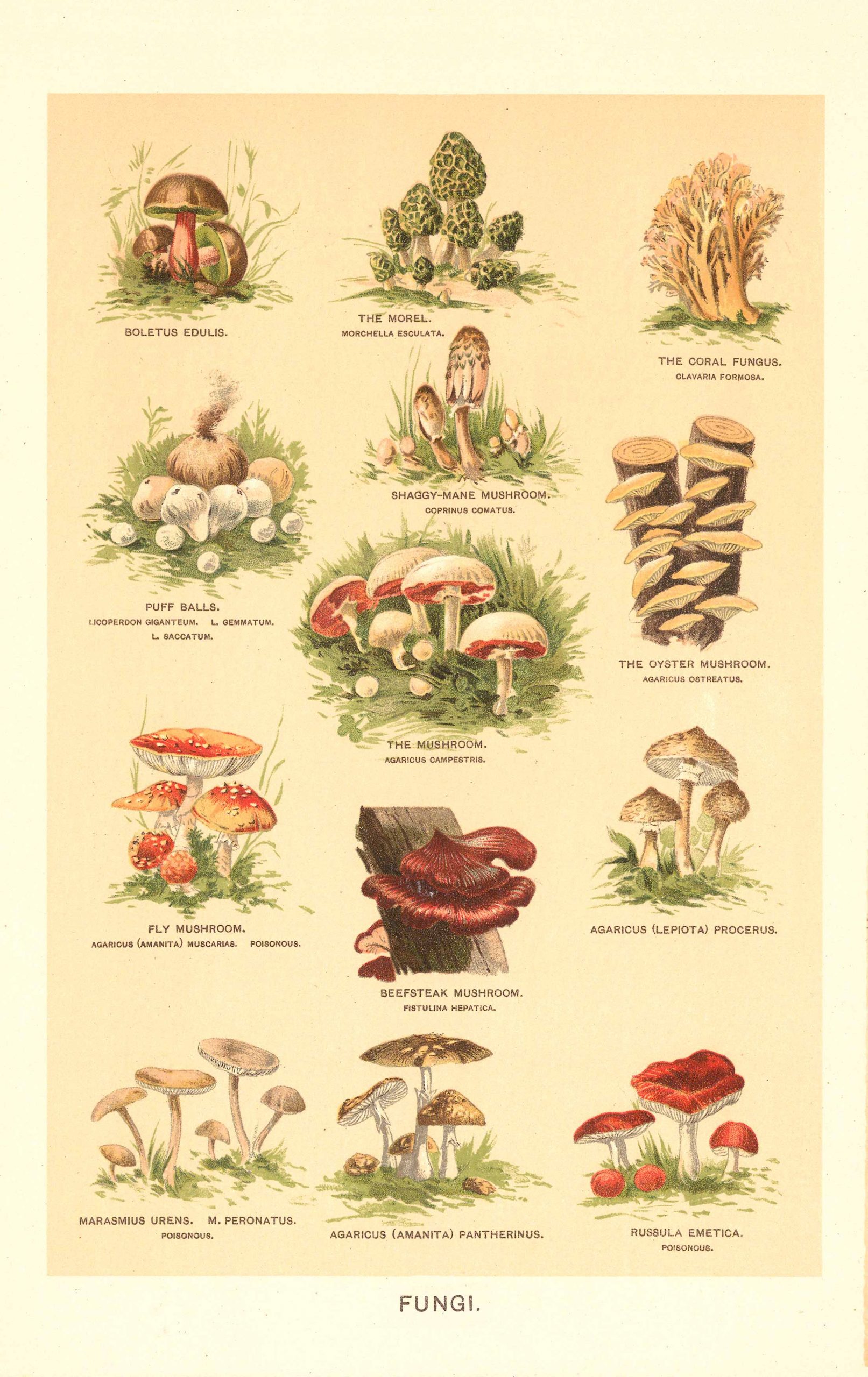 Fungi (Mushrooms). We are pleased to offer these beautifully colored prints from the 1896 Johnson’s Universal Cyclopedia.