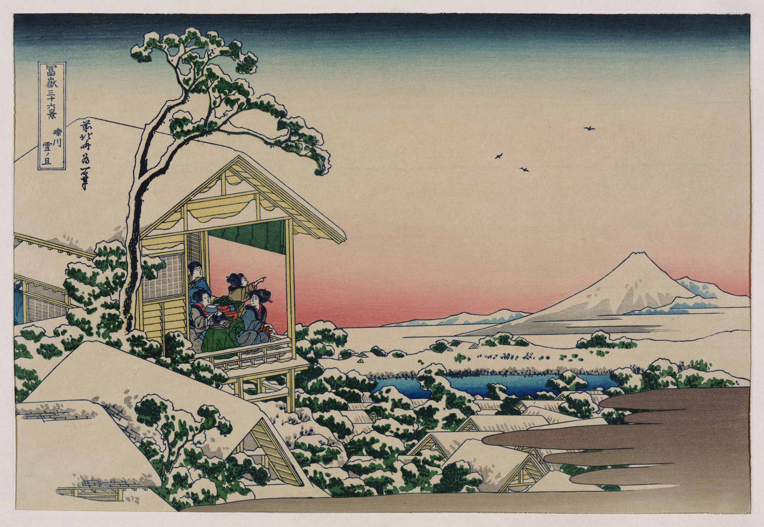 Print of men and women looking out at Mount Fuji from a tea house with snow covering the trees. This poster was created by artist Hokusai Katsushika circa 1890.