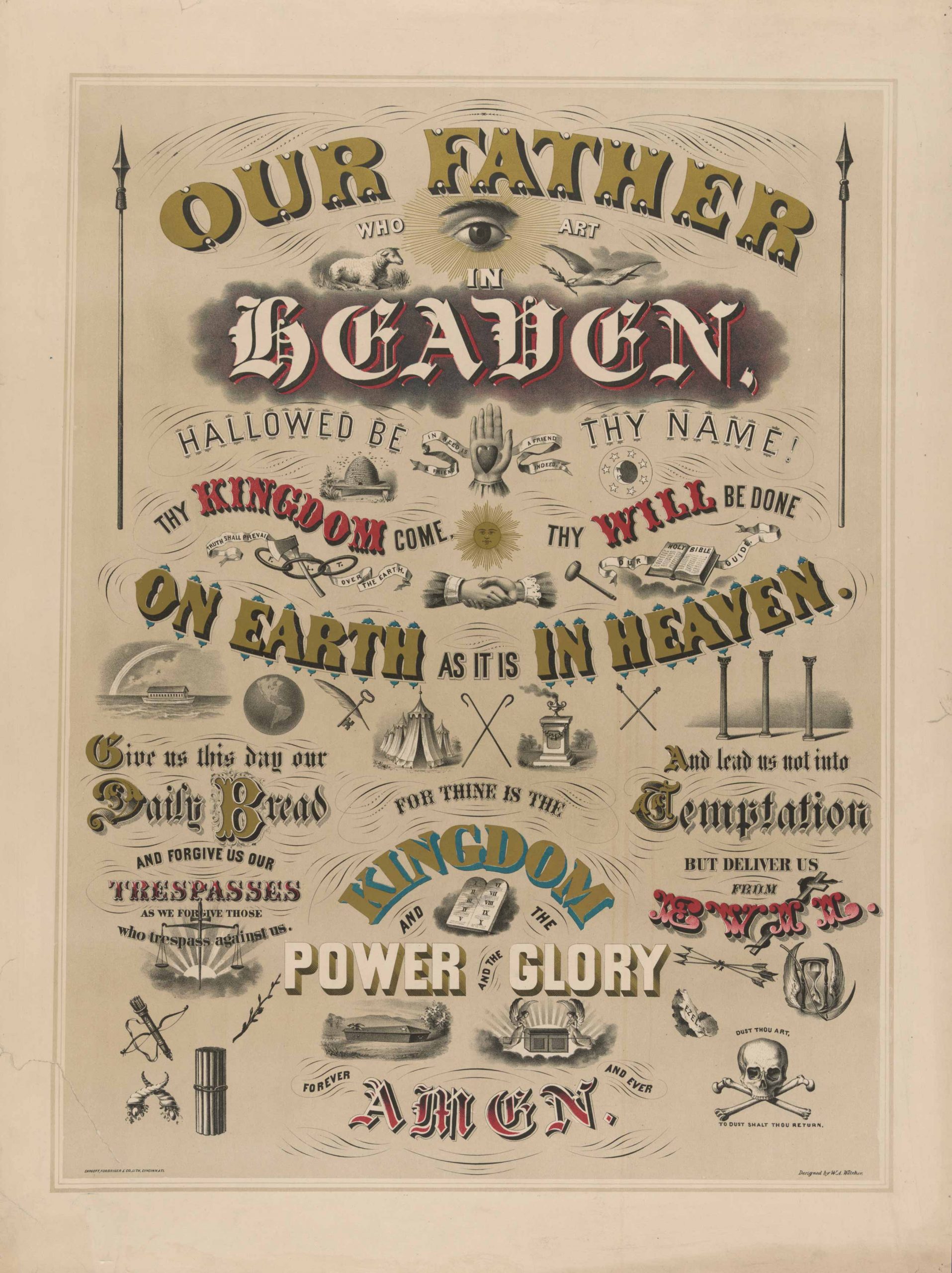 The Our Father Prayer displayed in ornate words and displayed next to symbols relating to the words and phrases. Designed by W.A. Welsh in 1873.