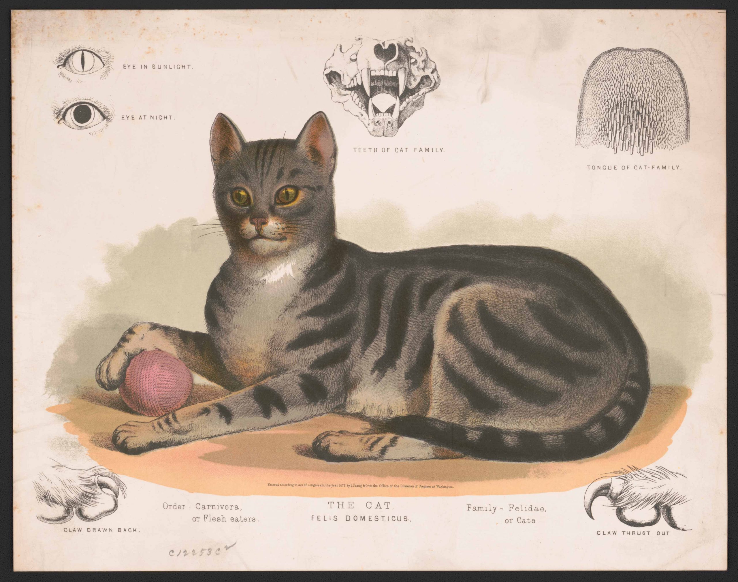 The Cat, Felis Domesticus. Family – Felidae or Cats, Order – Carnivora, or Flesh Eaters. Entered according to act of Congress in the year 1872 by L. Prang & Co. in the office of the Librarian of Congress in Washington. This poster shows a left side view of a domestic cat laying with its paw gracefully on a ball of yarn. Also featured: “Claw drawn back”, “claw thrust out”, “Tongue of cat-family”, “teeth of cat family”, “eye in sunlight” and “eye at night”.
